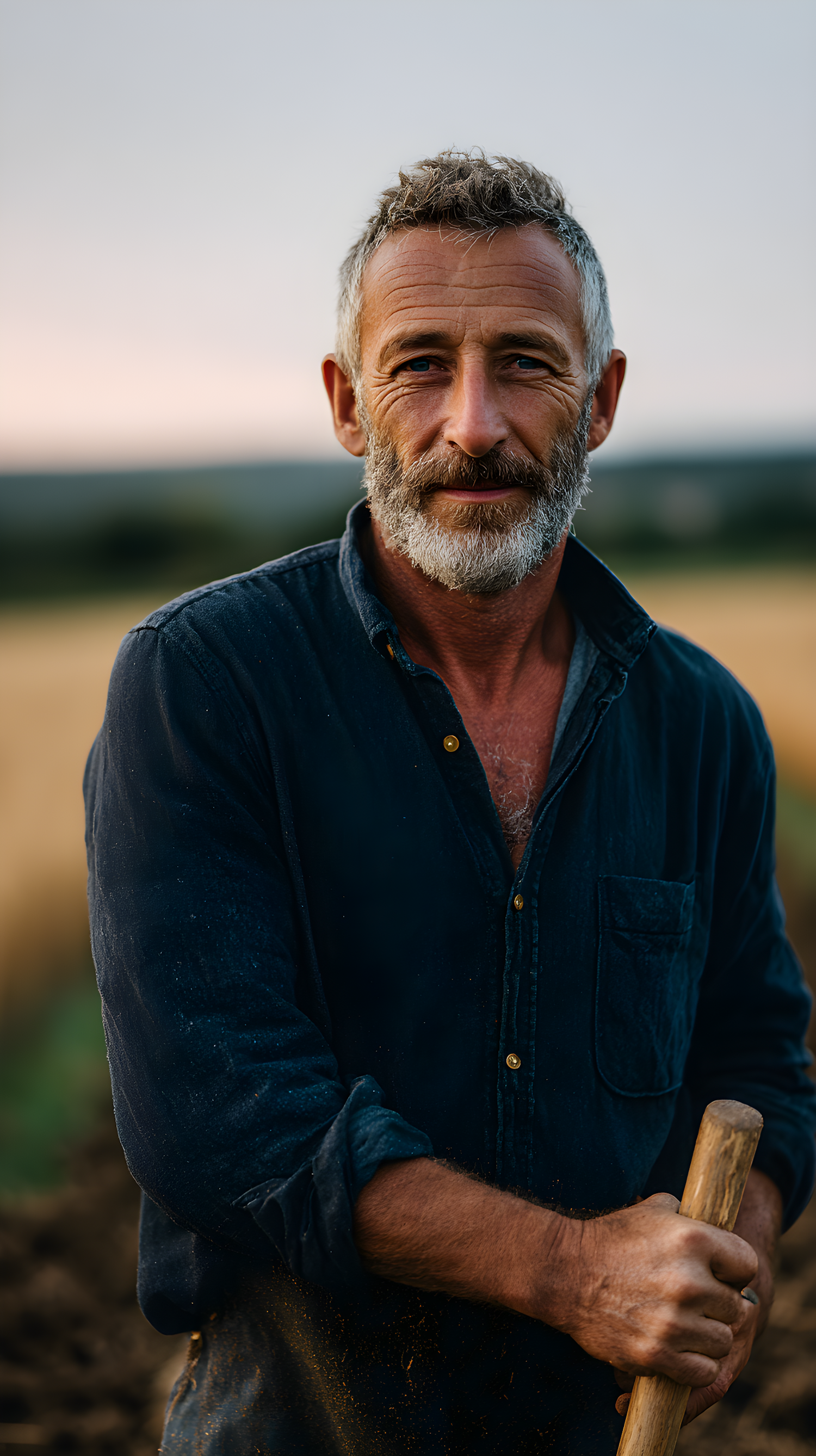A rugged man with gray hair and beard in a blue shirt stands in a field, holding a wooden tool, with a serene natural background.