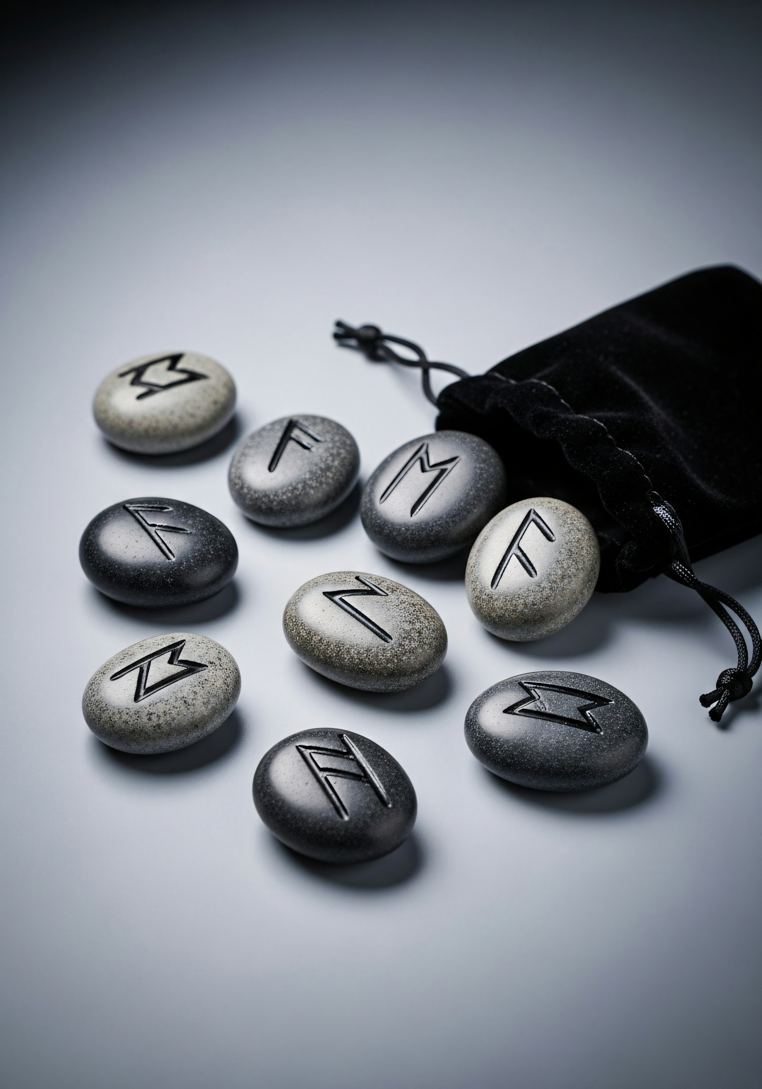 A set of engraved rune stones in shades of gray, accompanied by a black velvet pouch, arranged on a light surface.