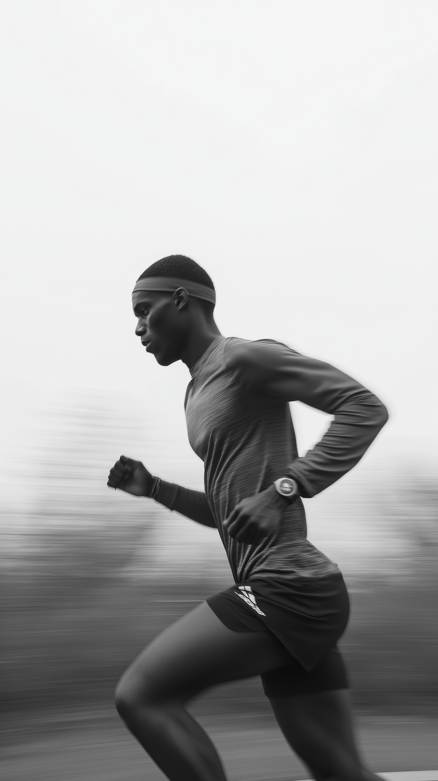 Dynamic black and white image of a focused runner in motion, wearing athletic gear and a watch, with a blurred background.