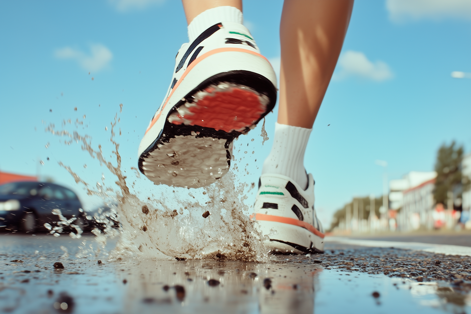 Close-up of running shoes splashing through a puddle on a sunny street, capturing motion and energy with vibrant colors and urban vibes.