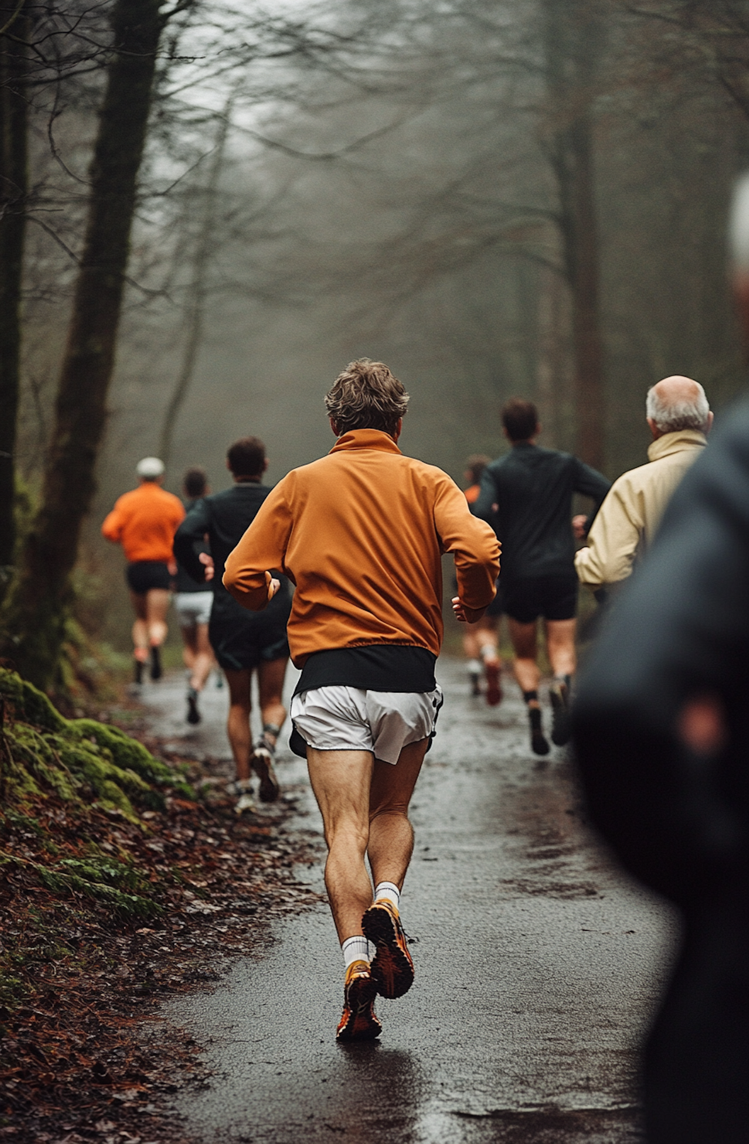 Runners in colorful gear jog through a misty forest path, creating a vibrant scene of movement and nature.