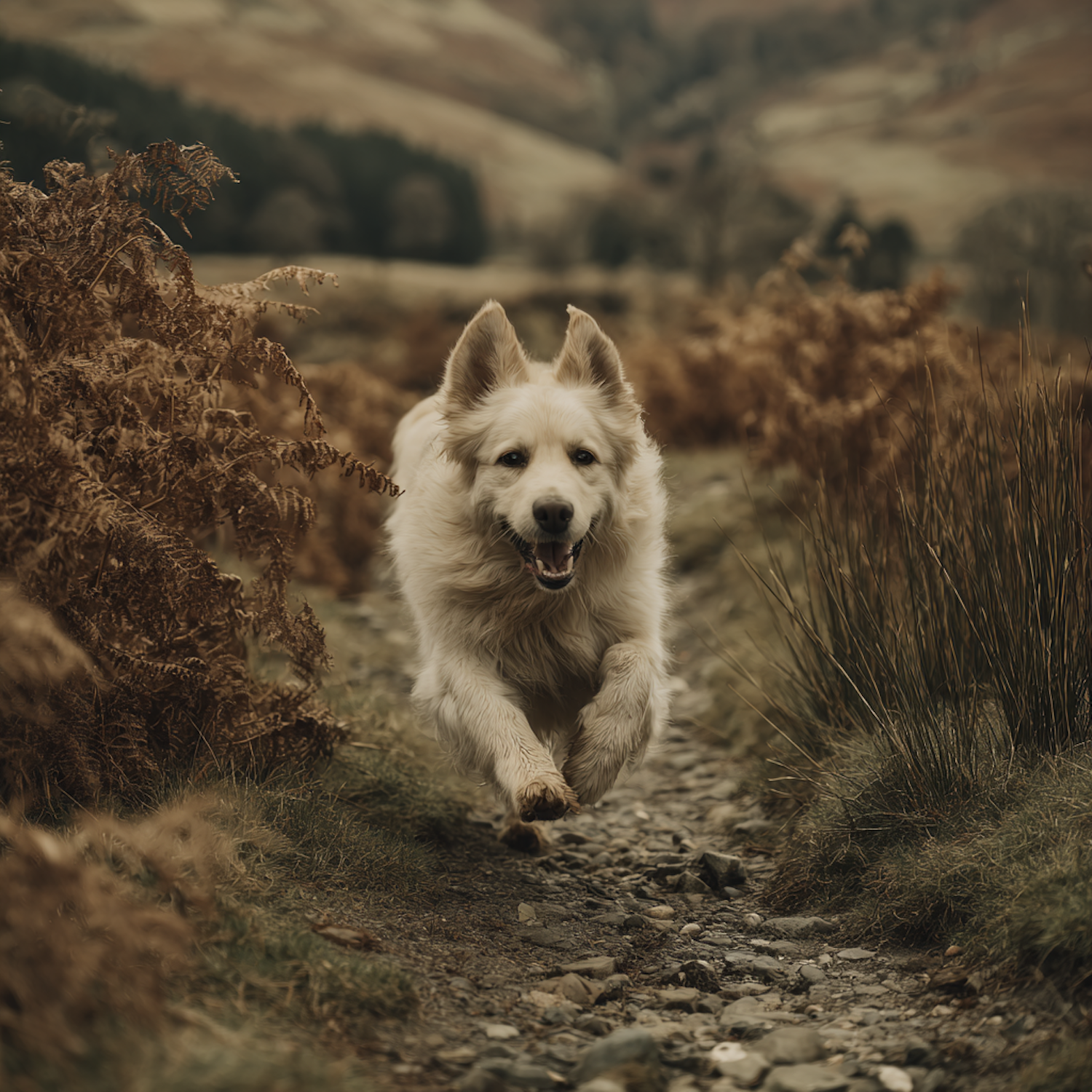 A cream-colored dog joyfully runs along a rocky path in a scenic countryside setting with autumnal tones and rolling hills in the background.
