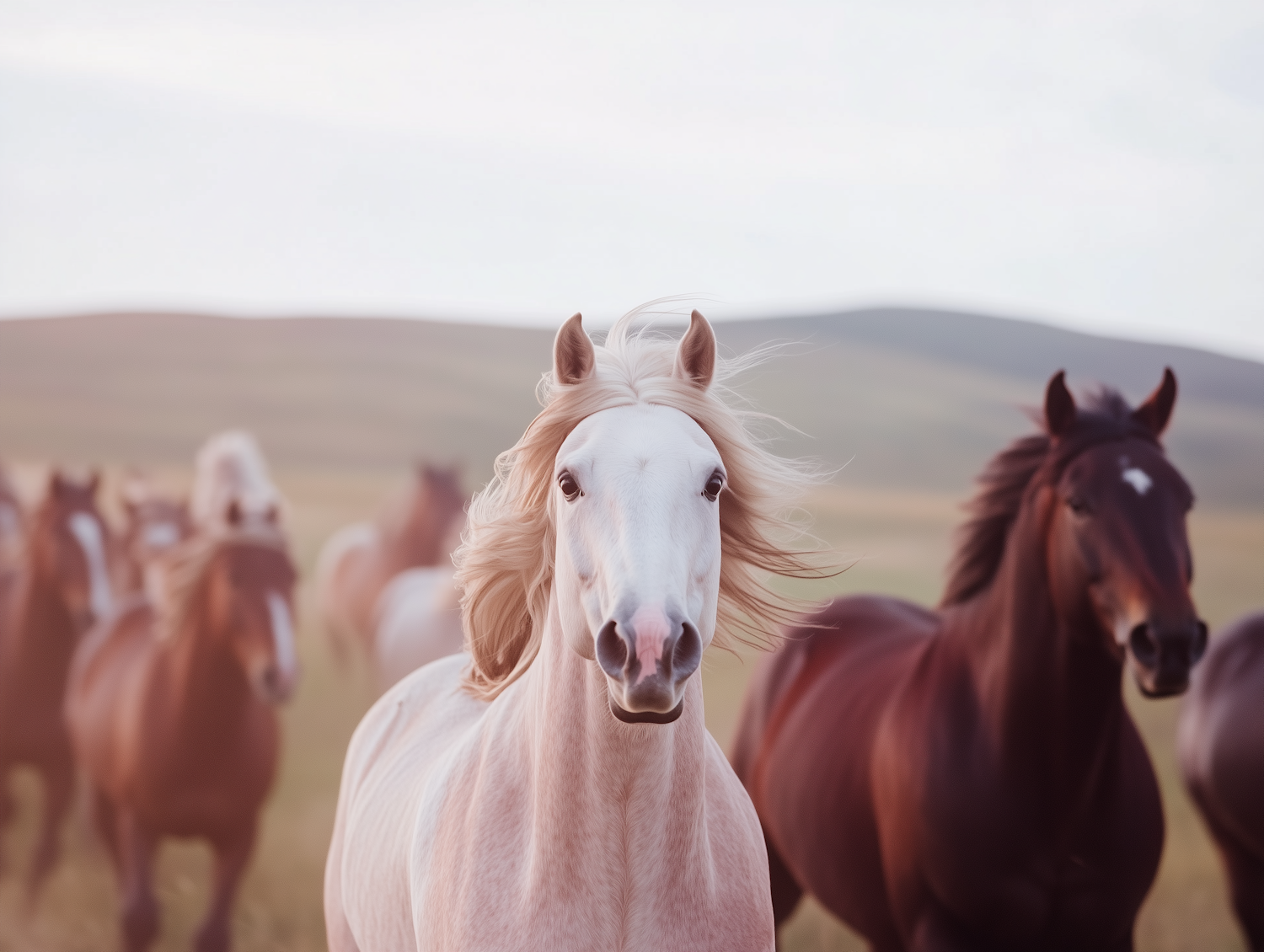 Majestic white horse leading a galloping herd across a grassy plain with rolling hills in the background.