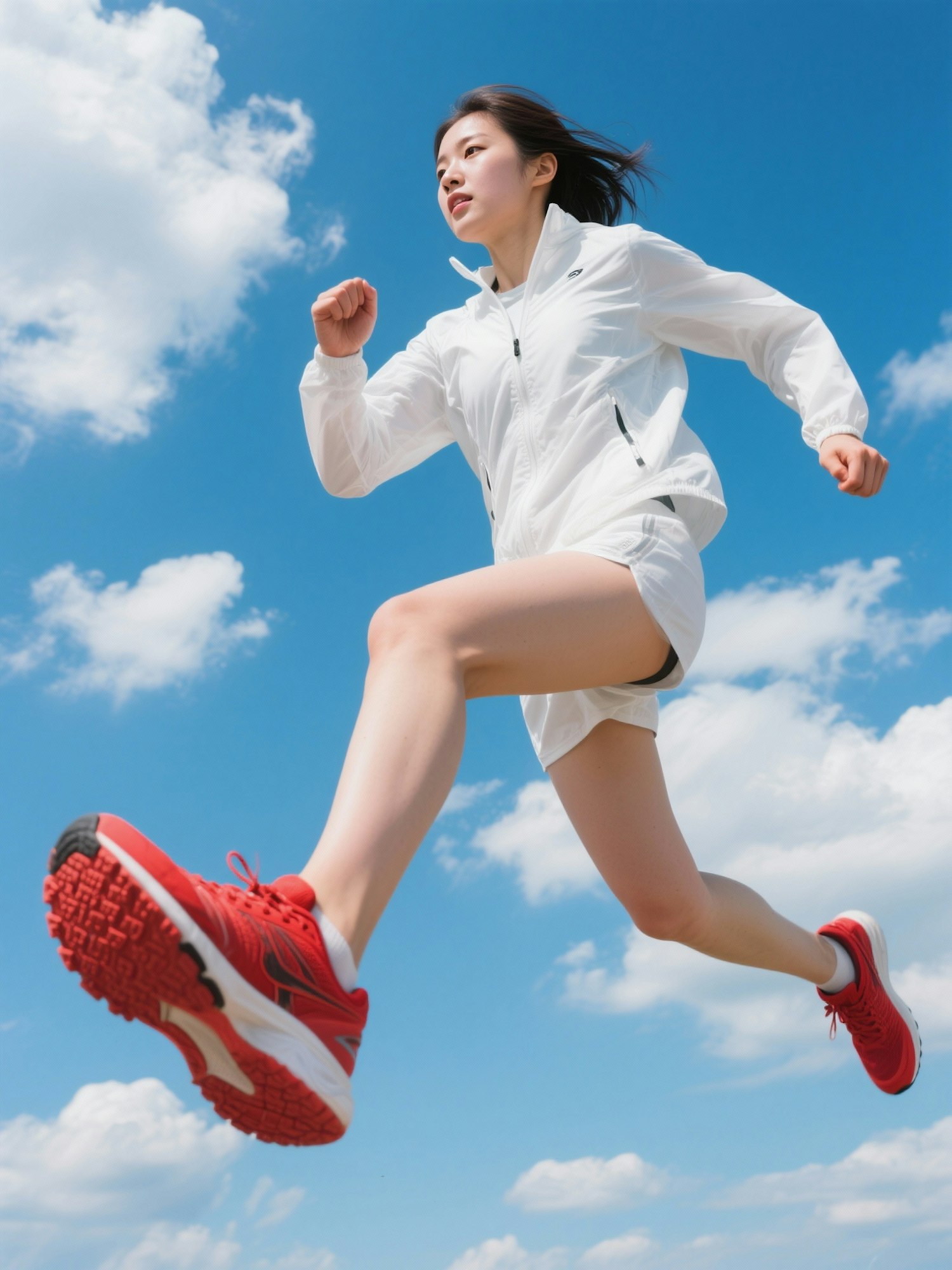 A powerful low-angle action shot of a 24-year-old Korean girl sprinting under a bright blue sky with scattered white clouds. She is wearing a white athletic running outfit with sporty details, a light jacket flowing behind her, and bright red running shoes with visible textured soles. Her stride is captured mid-air, arms pumping with determination, showing intensity and focus. The perspective from below emphasizes her leap forward against the sky, conveying speed, energy, and athletic power. High resolution, sharp details, professional sports photography style.
