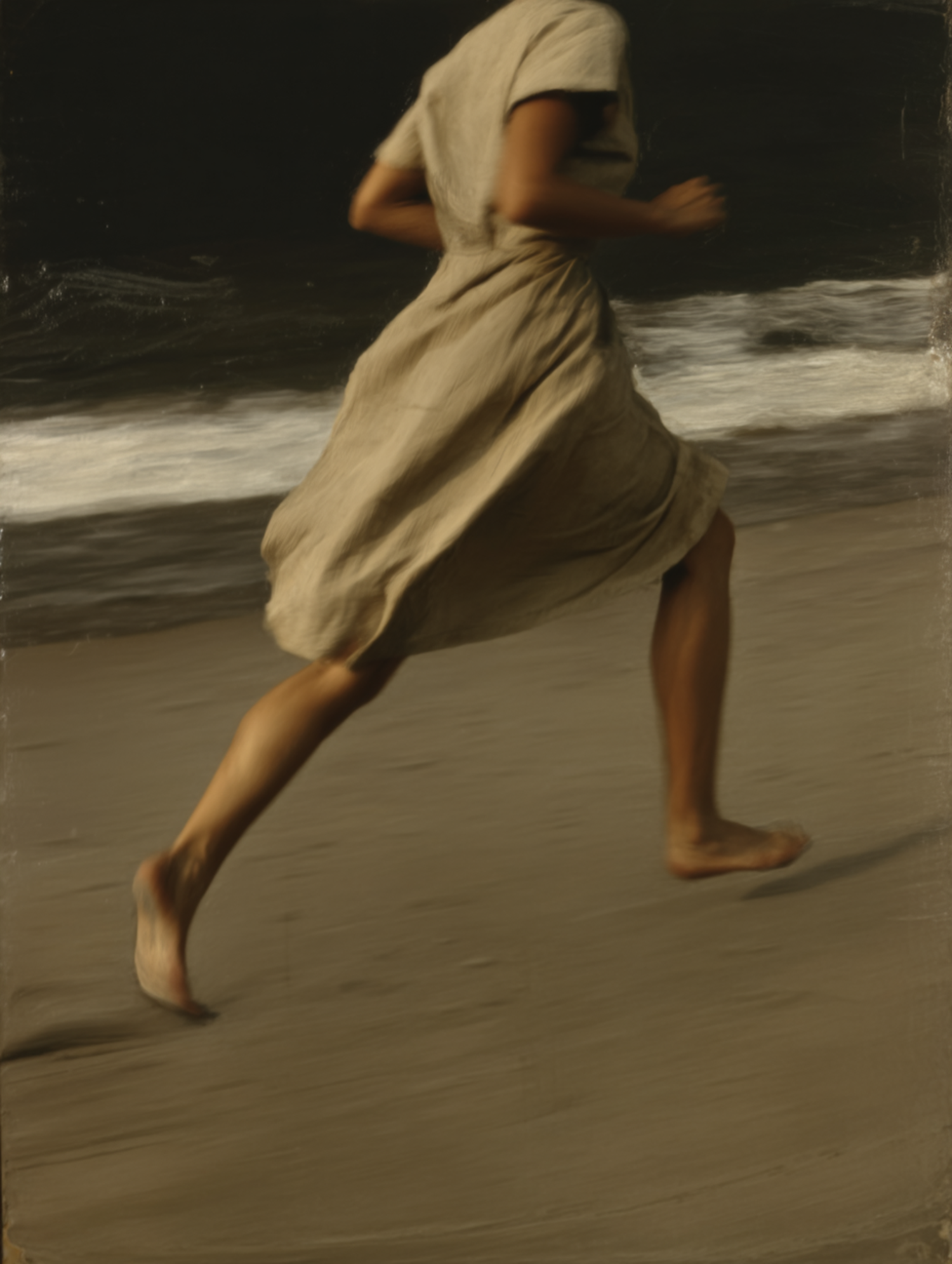 Blurred motion of a person running barefoot on a beach, wearing a beige dress, with ocean waves in the background.
