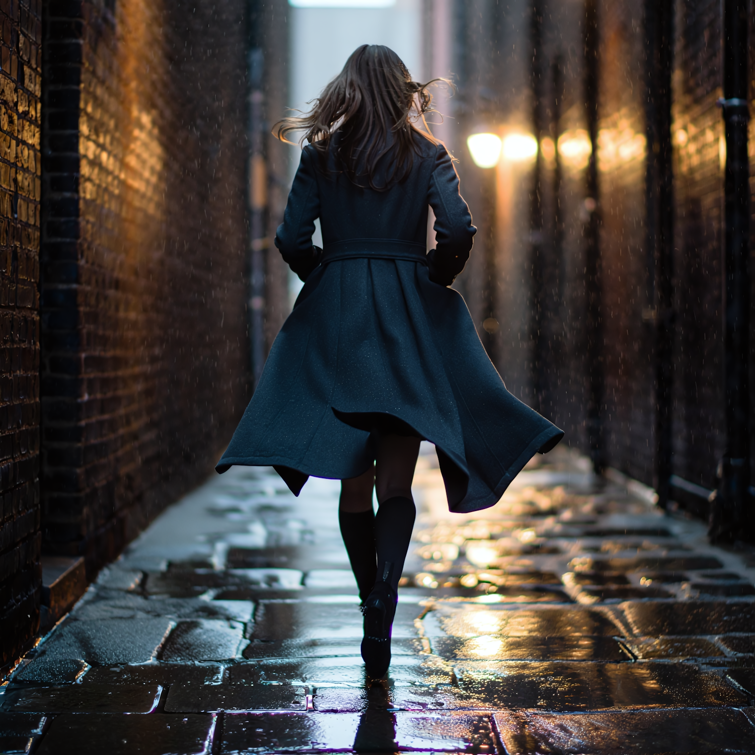 A woman in a dark coat walks through a rainy, dimly lit alley with glowing streetlights reflecting on wet cobblestones.