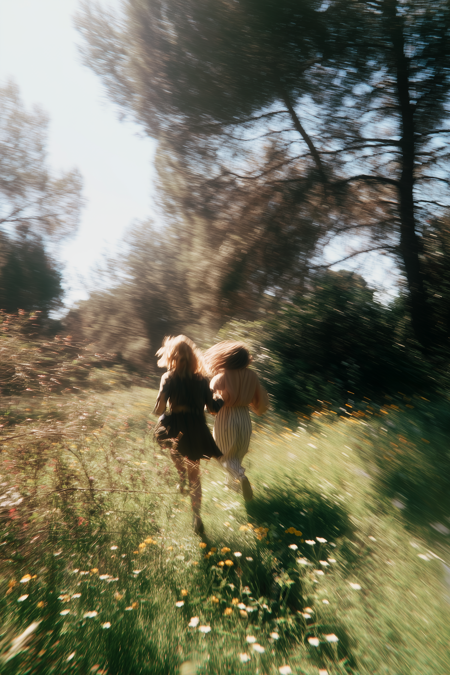 People running joyously through a sunlit meadow with wildflowers, framed by lush greenery and blurred tree lines.