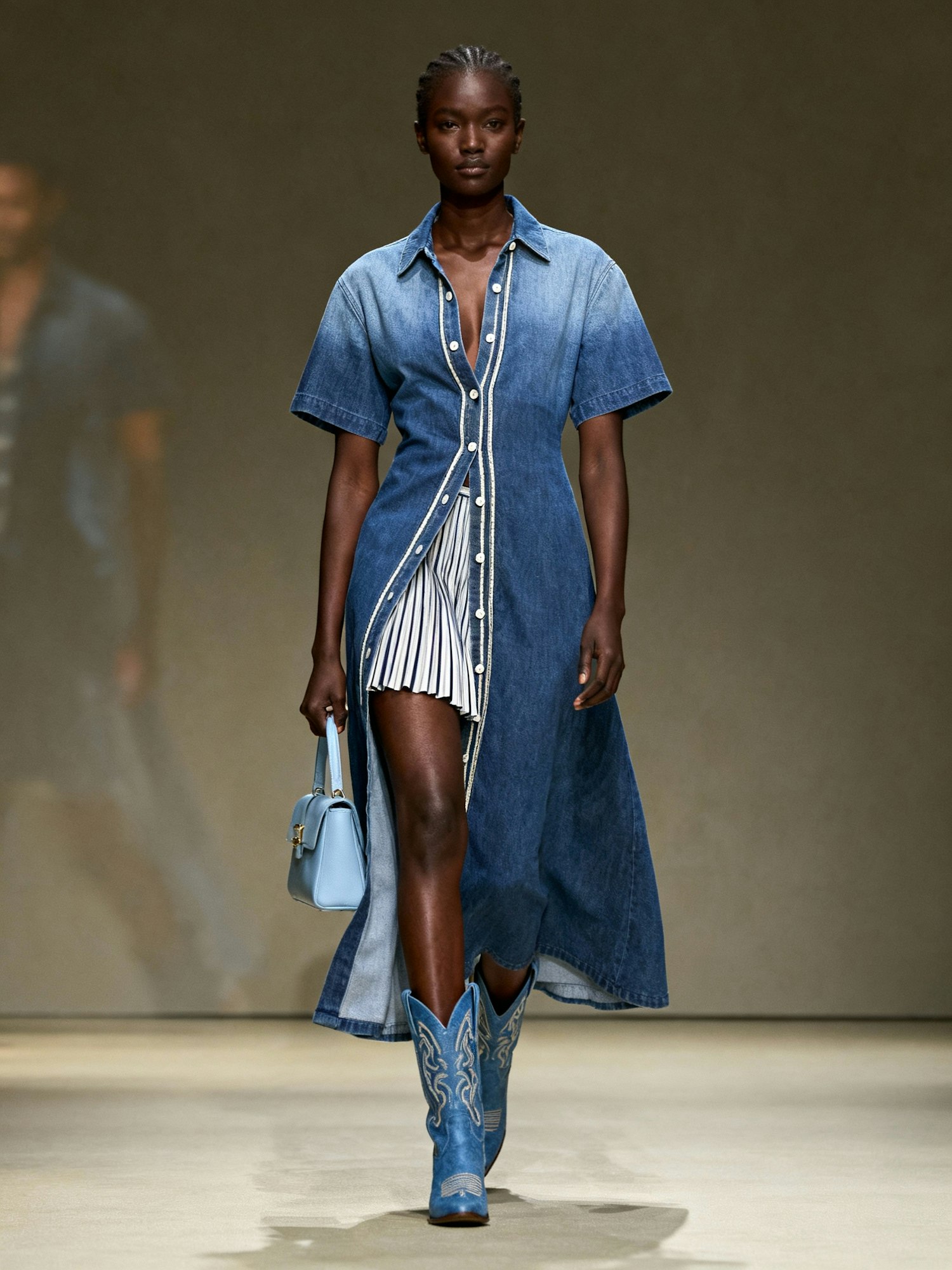Model in a denim dress with cowboy boots and a blue handbag on a runway, showcasing a chic and modern fashion ensemble.