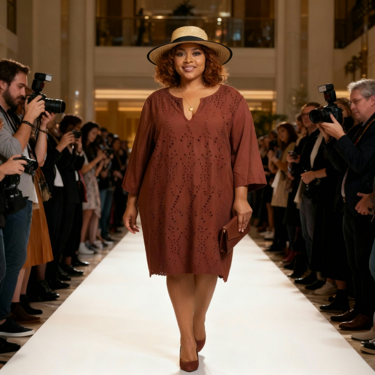 A woman in a brown dress and straw hat walks a runway, surrounded by photographers in an elegant indoor setting.