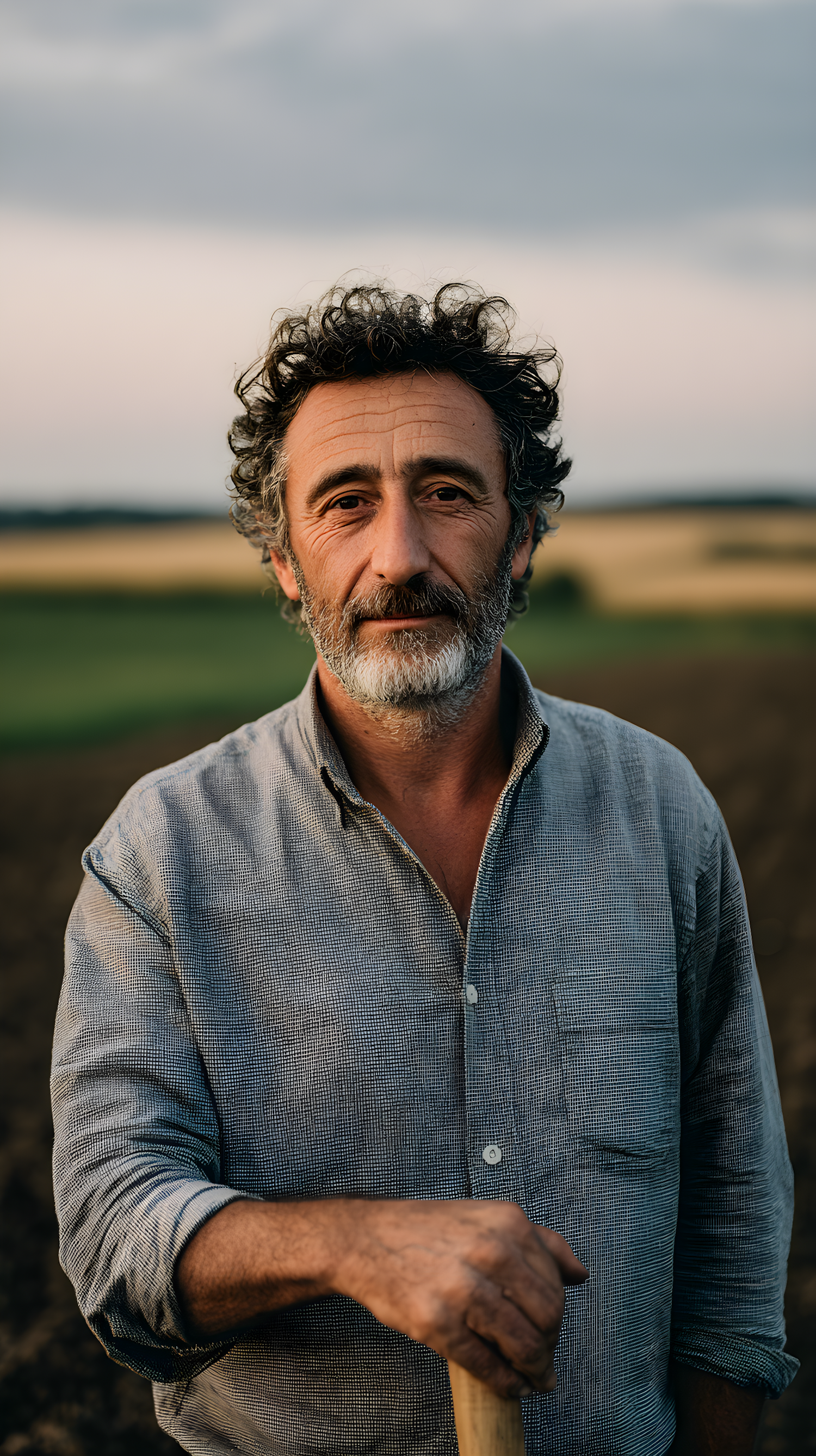 A middle-aged man with curly hair and a beard stands in a rural field, holding a tool, with a serene landscape in the background.