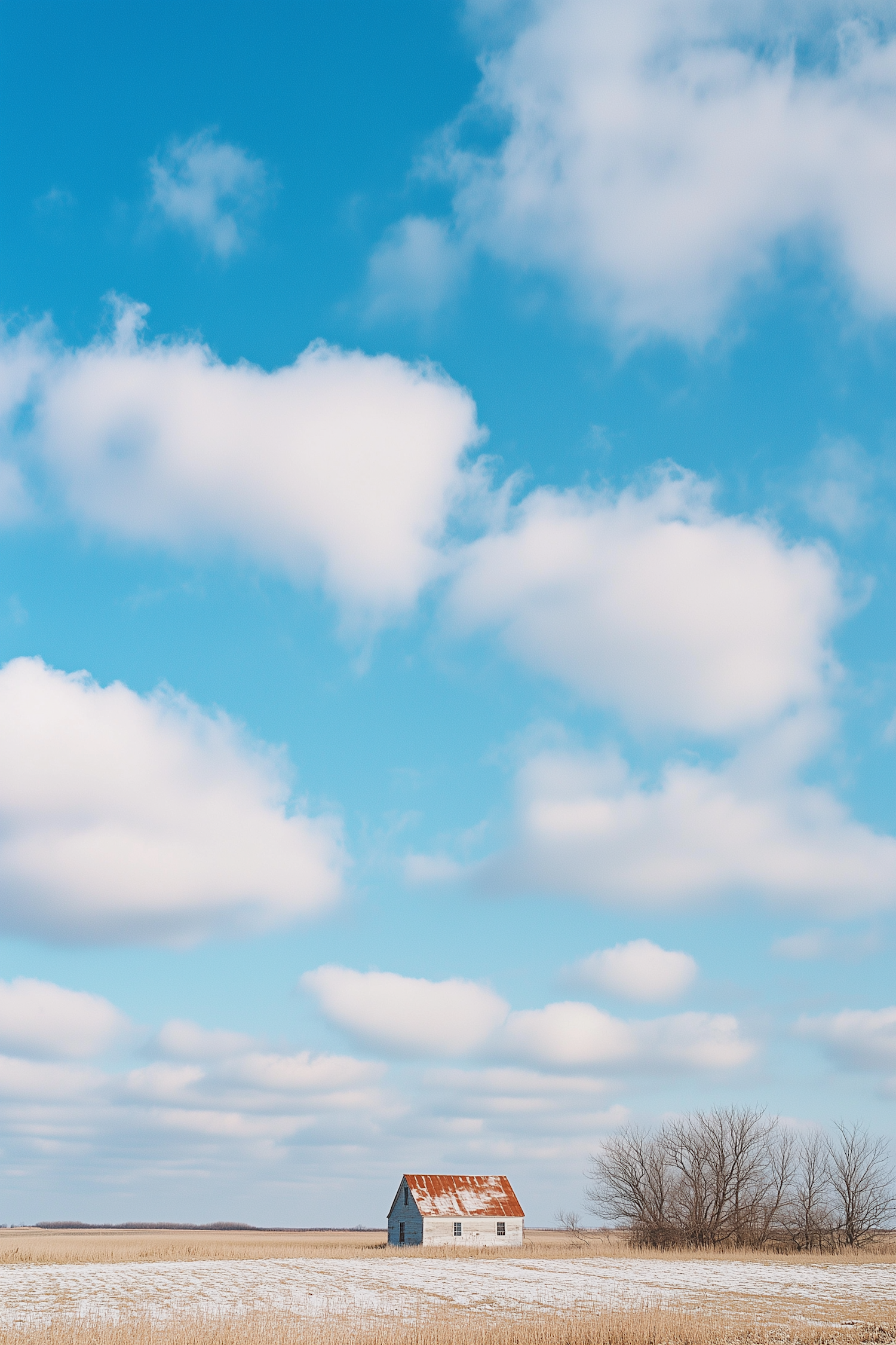 A rustic house with a red roof sits in a snowy field under a bright blue sky with fluffy clouds, evoking peaceful rural charm.