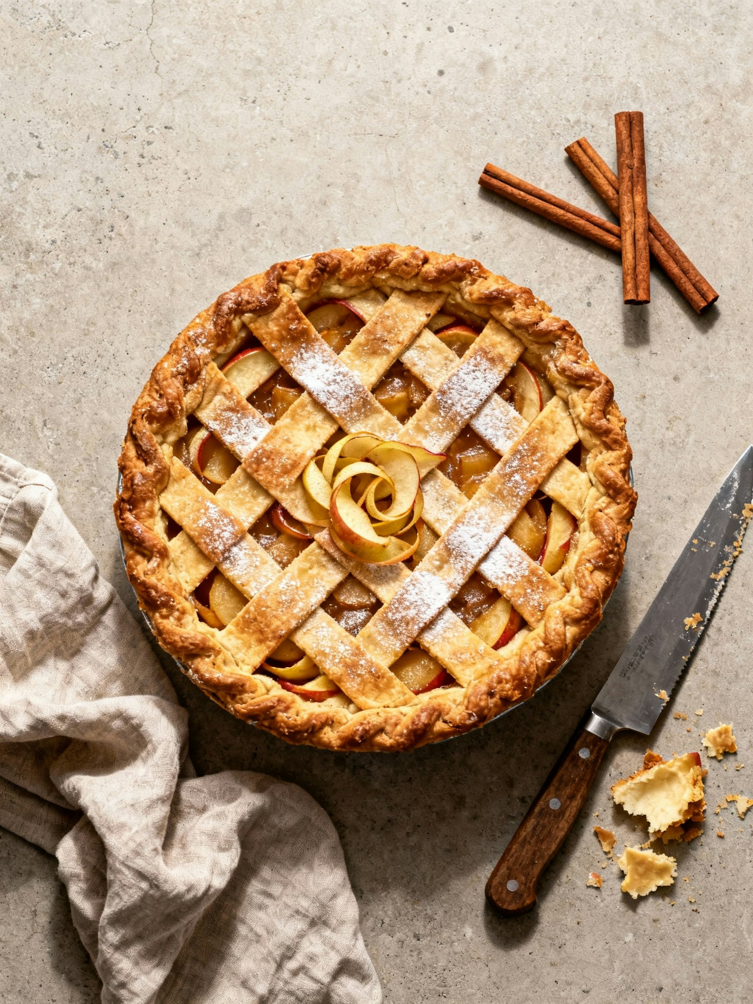 A golden lattice apple pie with powdered sugar, cinnamon sticks, and a rustic knife on a stone surface. Perfect for dessert lovers.