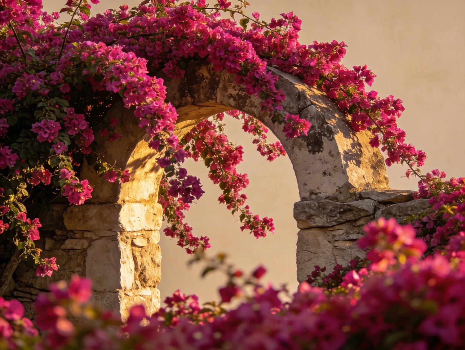 A stone arch covered in vibrant pink bougainvillea flowers, illuminated by warm sunlight, creating a serene and picturesque scene.