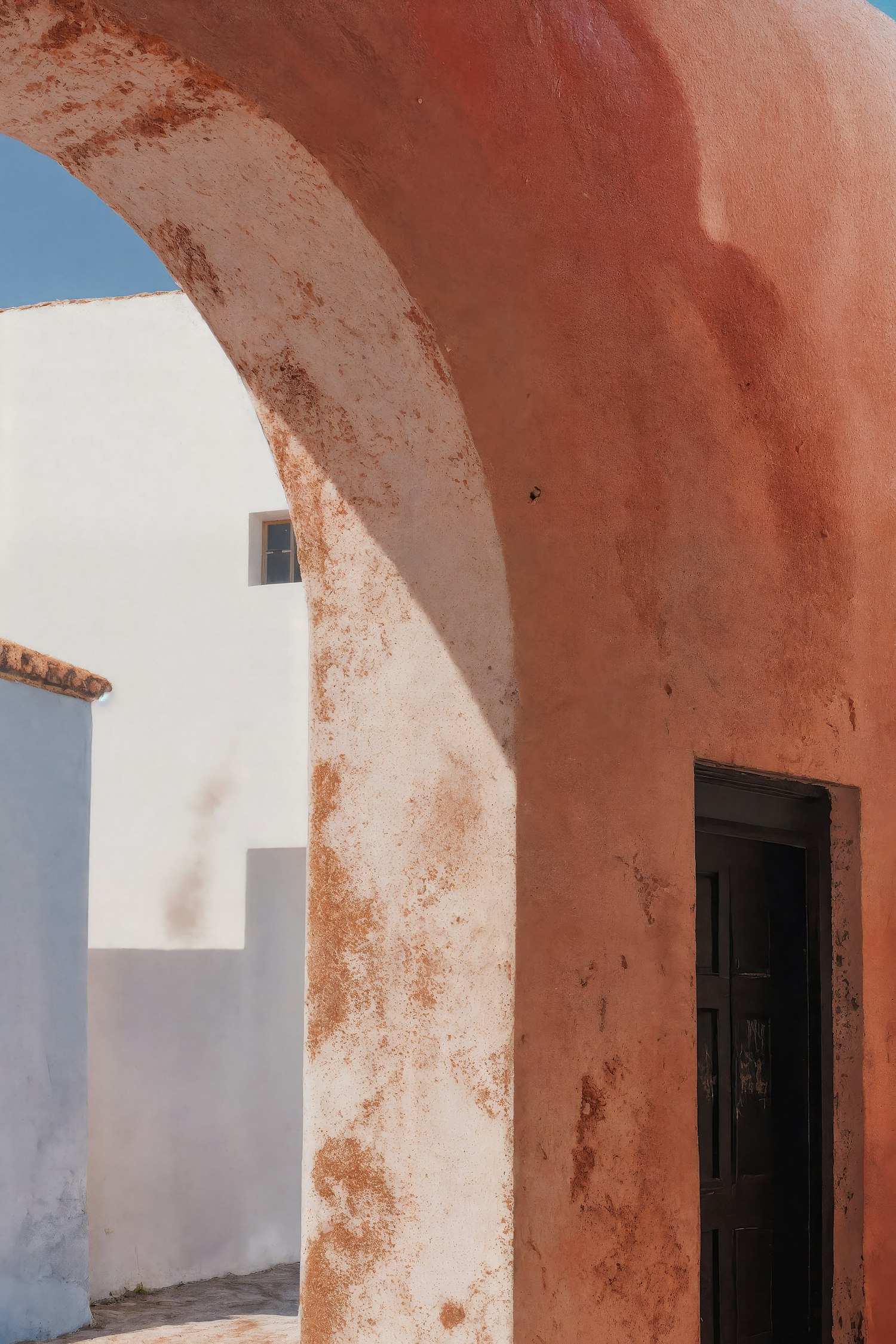 Rustic reddish-brown archway framing a white stucco building with a small window, under a bright blue sky.