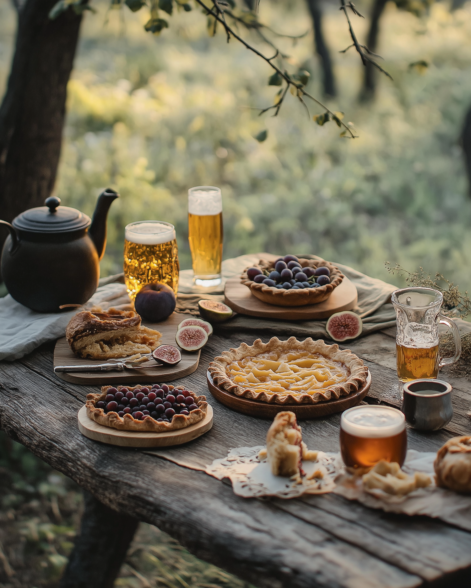 Rustic outdoor table with pies, figs, and drinks in a serene, natural setting. Warm lighting enhances the cozy atmosphere.
