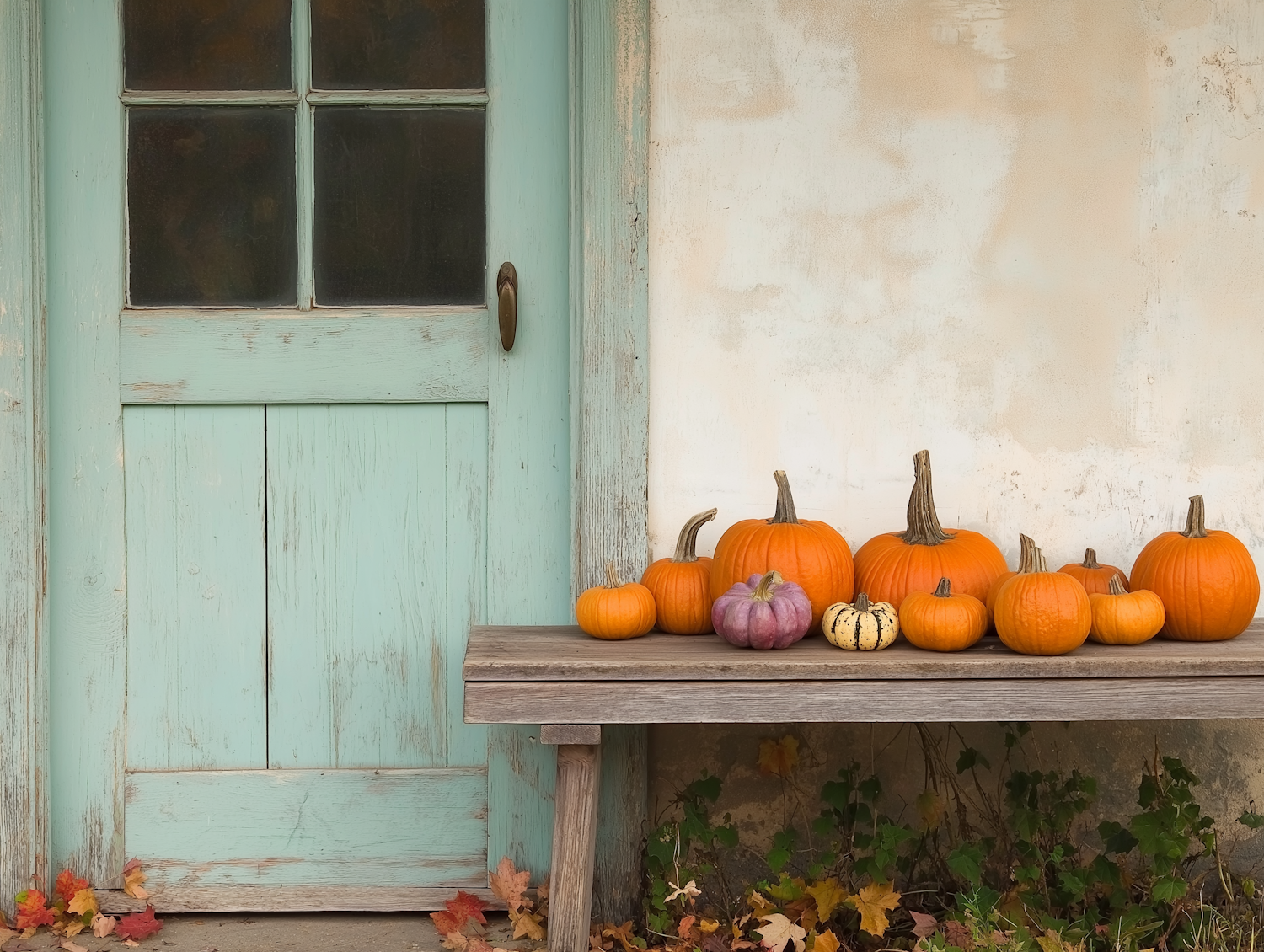 Rustic autumn scene with a turquoise door, pumpkins on a bench, and scattered fall leaves, creating a cozy seasonal atmosphere.