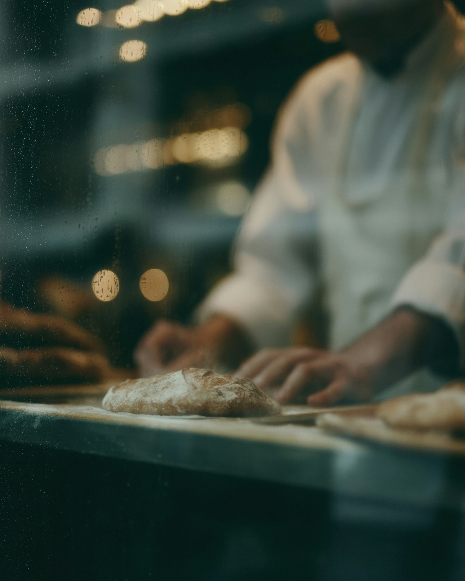 Rustic bread on a floured counter with a baker working in the background, set in a cozy, warmly lit bakery.