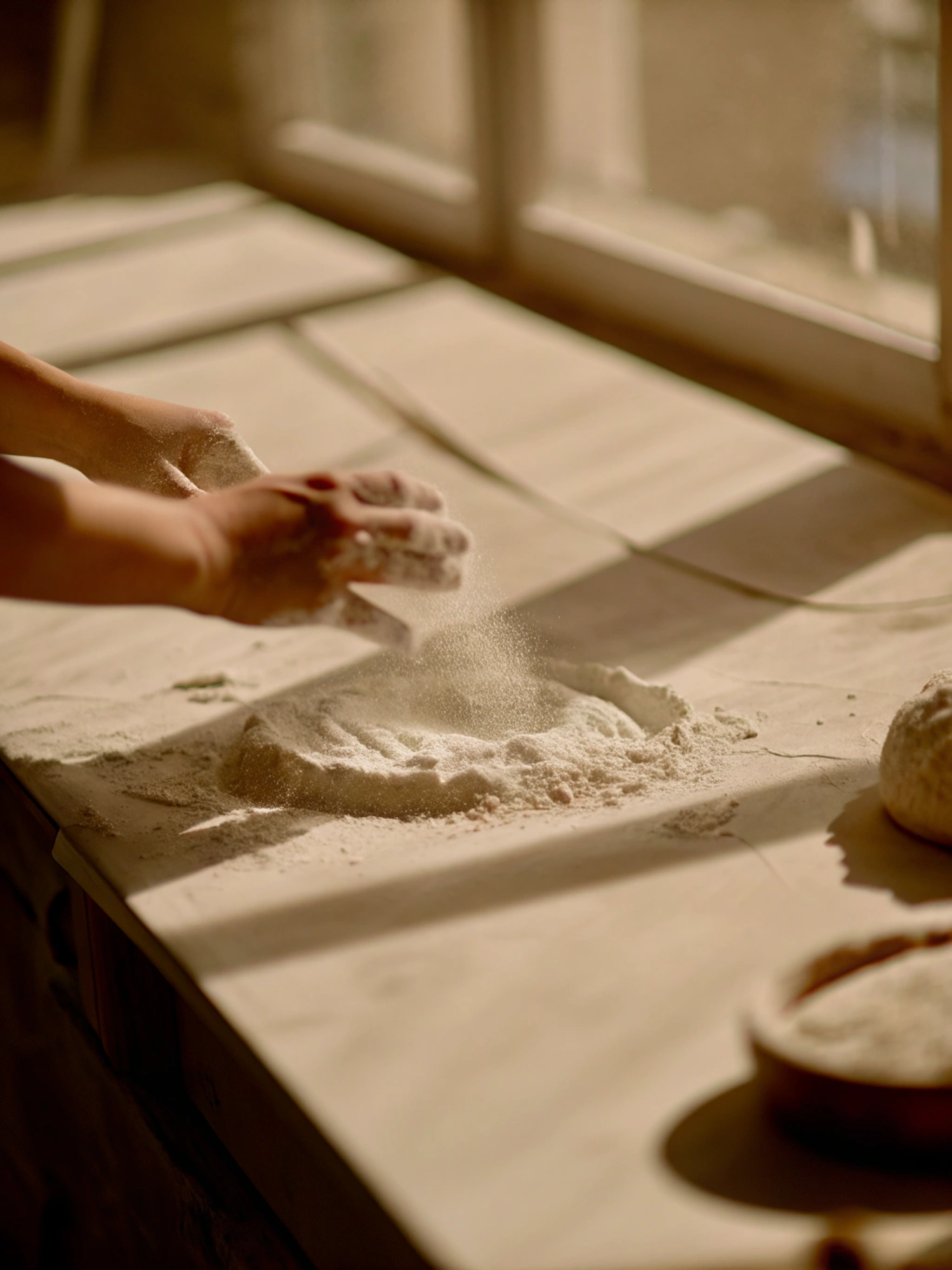 Warm sunlight illuminates hands sprinkling flour on a wooden counter, with bread and a bowl nearby, evoking a cozy baking scene.