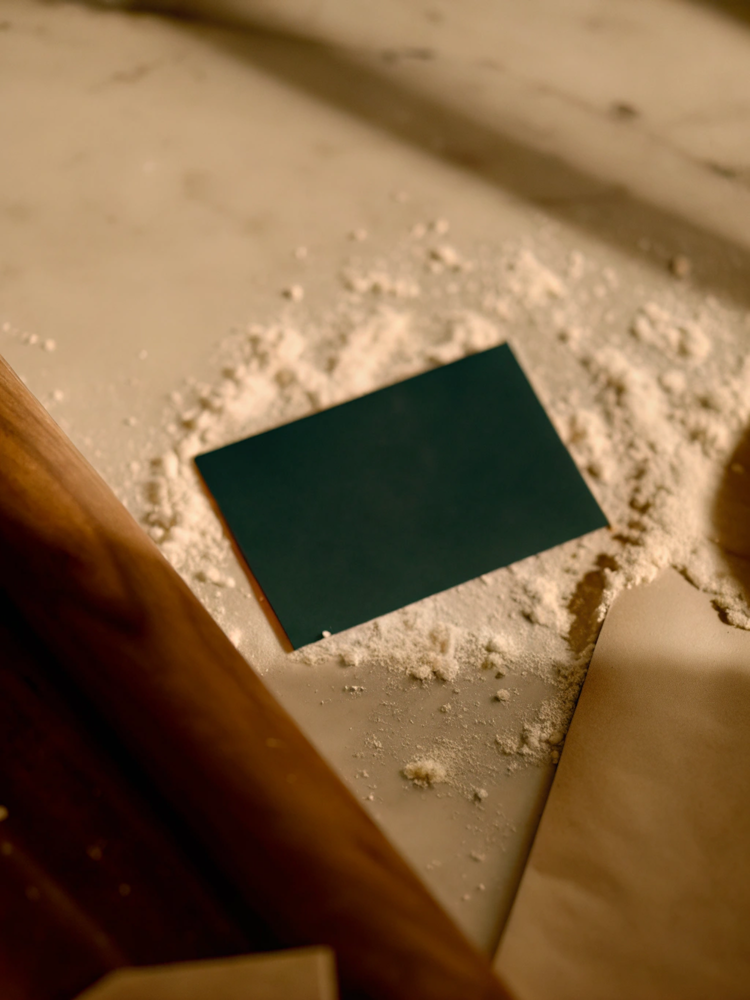 A dark green card on a flour-dusted marble countertop with a rolling pin and parchment paper, evoking a cozy baking setup.