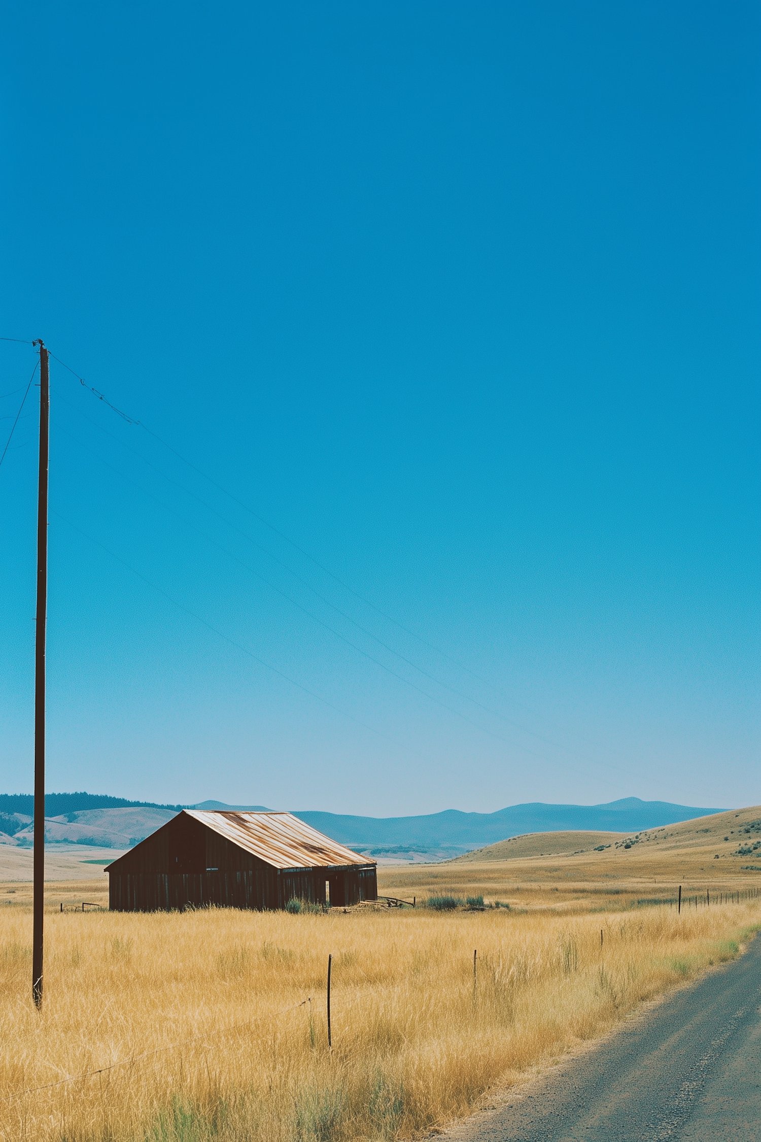 Rustic barn in a golden field under a vibrant blue sky, with rolling hills and a dirt road creating a peaceful rural scene.