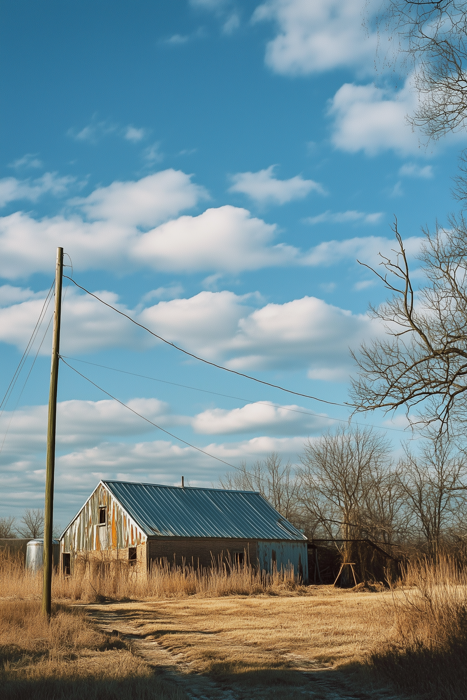 Rustic barn with a metal roof in a golden field under a blue sky with fluffy clouds, framed by bare trees and a utility pole.