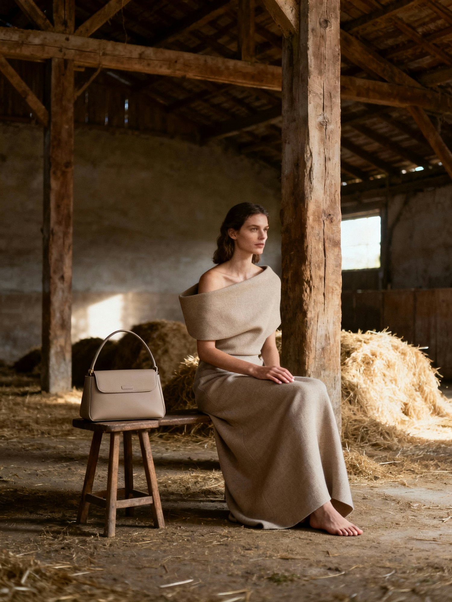 A refined rural setting inspired by the French countryside. Soft daylight, muted earthy tones, linen fabrics, wooden textures, and natural minimalism. The atmosphere feels calm, tactile, and contemporary — blending rustic authenticity with quiet elegance. Inspired by Jacquemus campaigns — refined simplicity, sculptural styling, and poetic tension between raw and delicate. A seated model in a barn interior, surrounded by folded linen and straw. She wears a long beige dress with sculptural shoulders, barefoot on the ground. A Jacquemus handbag rests beside her on a wooden stool, light falling softly on her face and fabric.