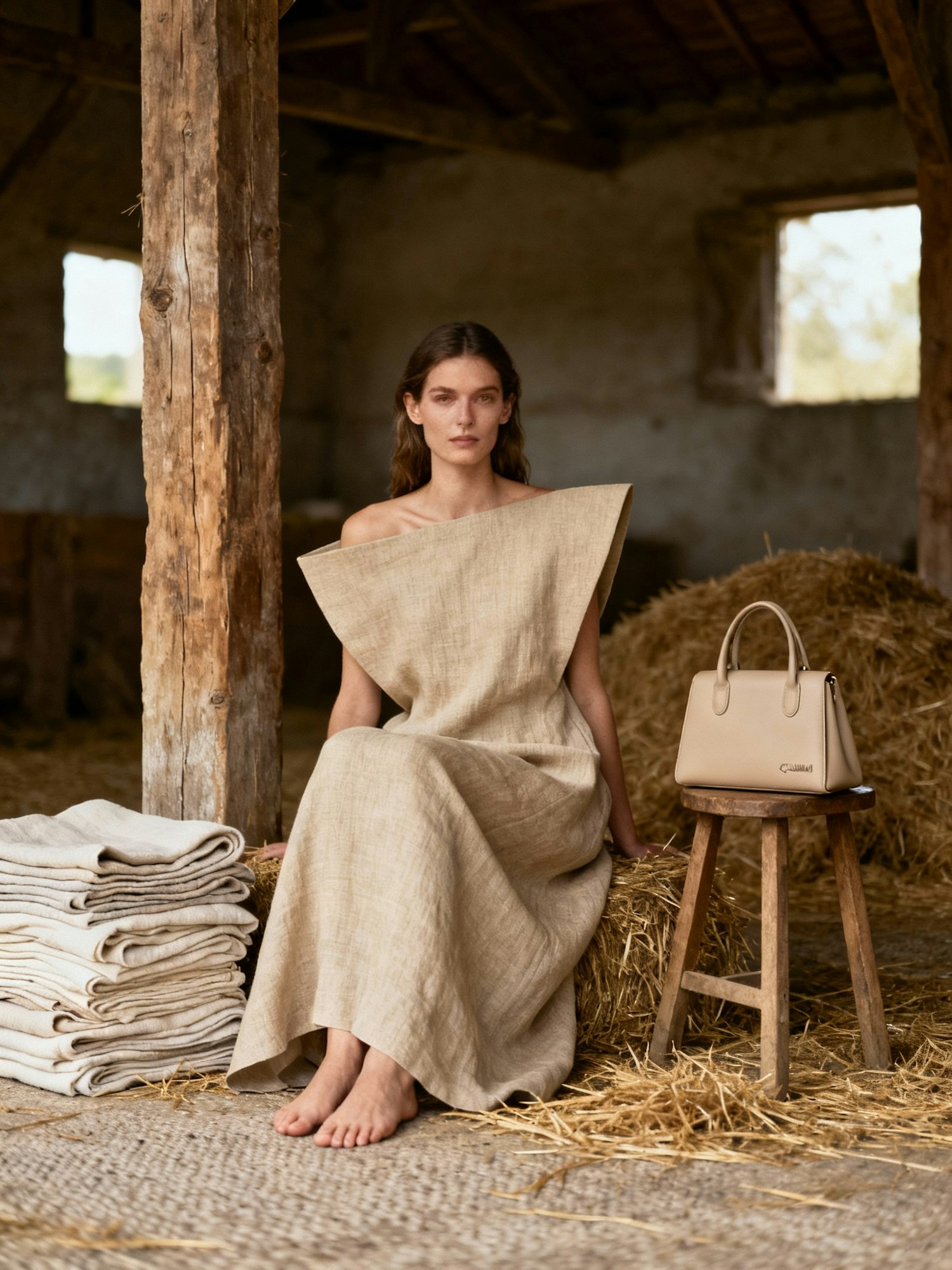 A refined rural setting inspired by the French countryside. Soft daylight, muted earthy tones, linen fabrics, wooden textures, and natural minimalism. The atmosphere feels calm, tactile, and contemporary — blending rustic authenticity with quiet elegance. Inspired by Jacquemus campaigns — refined simplicity, sculptural styling, and poetic tension between raw and delicate. A seated model in a barn interior, surrounded by folded linen and straw. She wears a long beige dress with sculptural shoulders, barefoot on the ground. A Jacquemus handbag rests beside her on a wooden stool, light falling softly on her face and fabric.