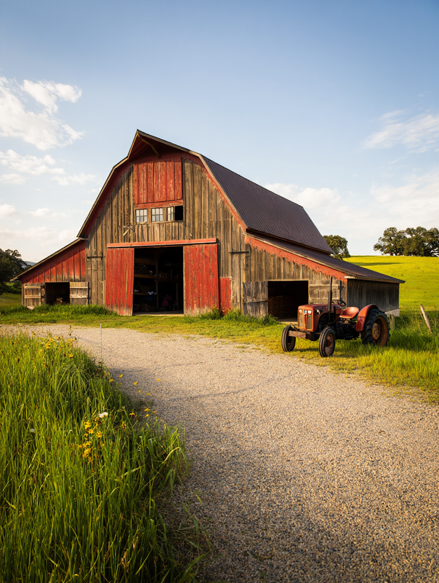 Rustic red barn and an old tractor bathed in warm sunlight on a gravel path, set against a serene countryside landscape.