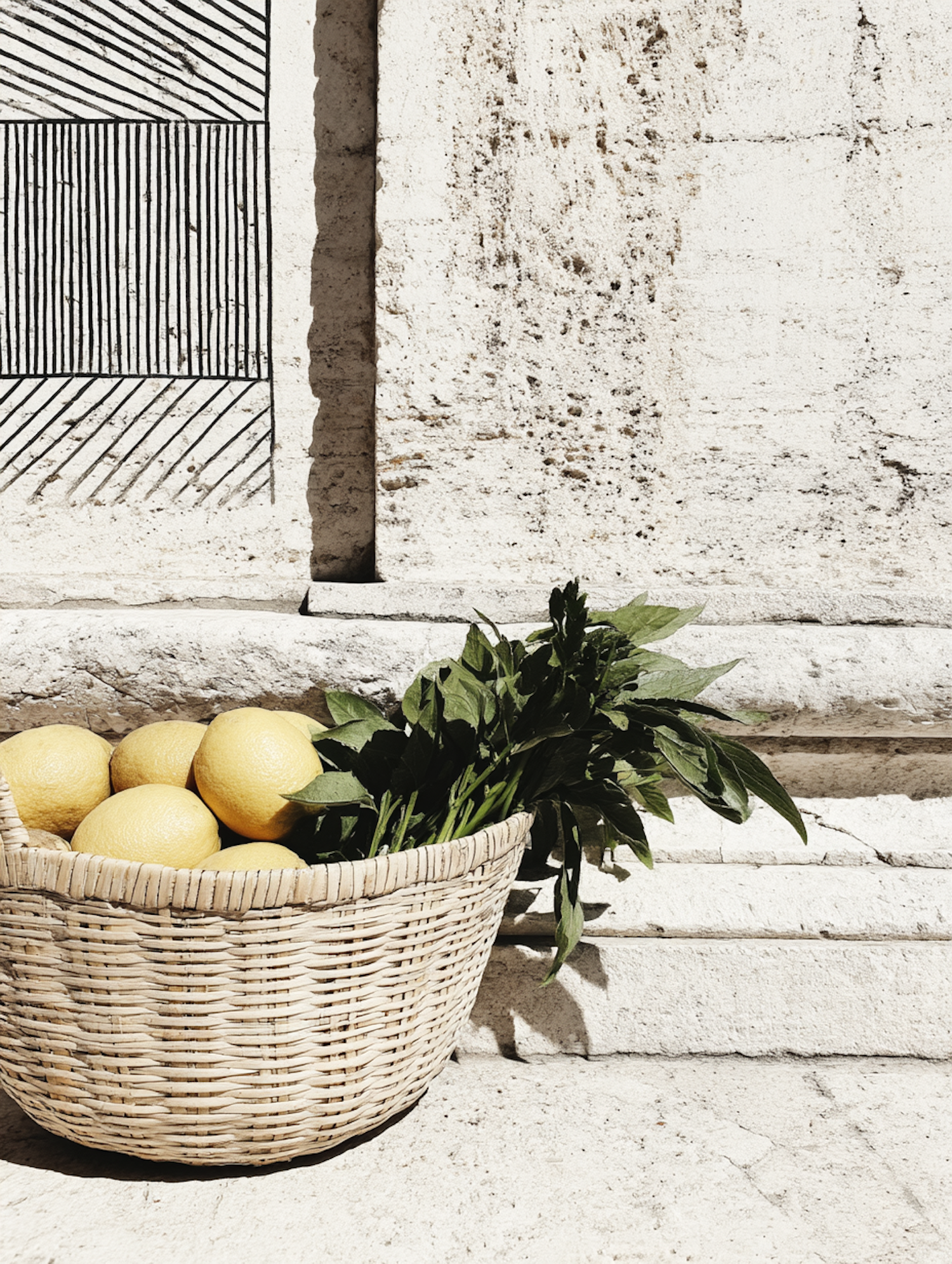 A wicker basket with lemons and herbs on a sunlit stone step, set against a textured wall with geometric black-and-white patterns.