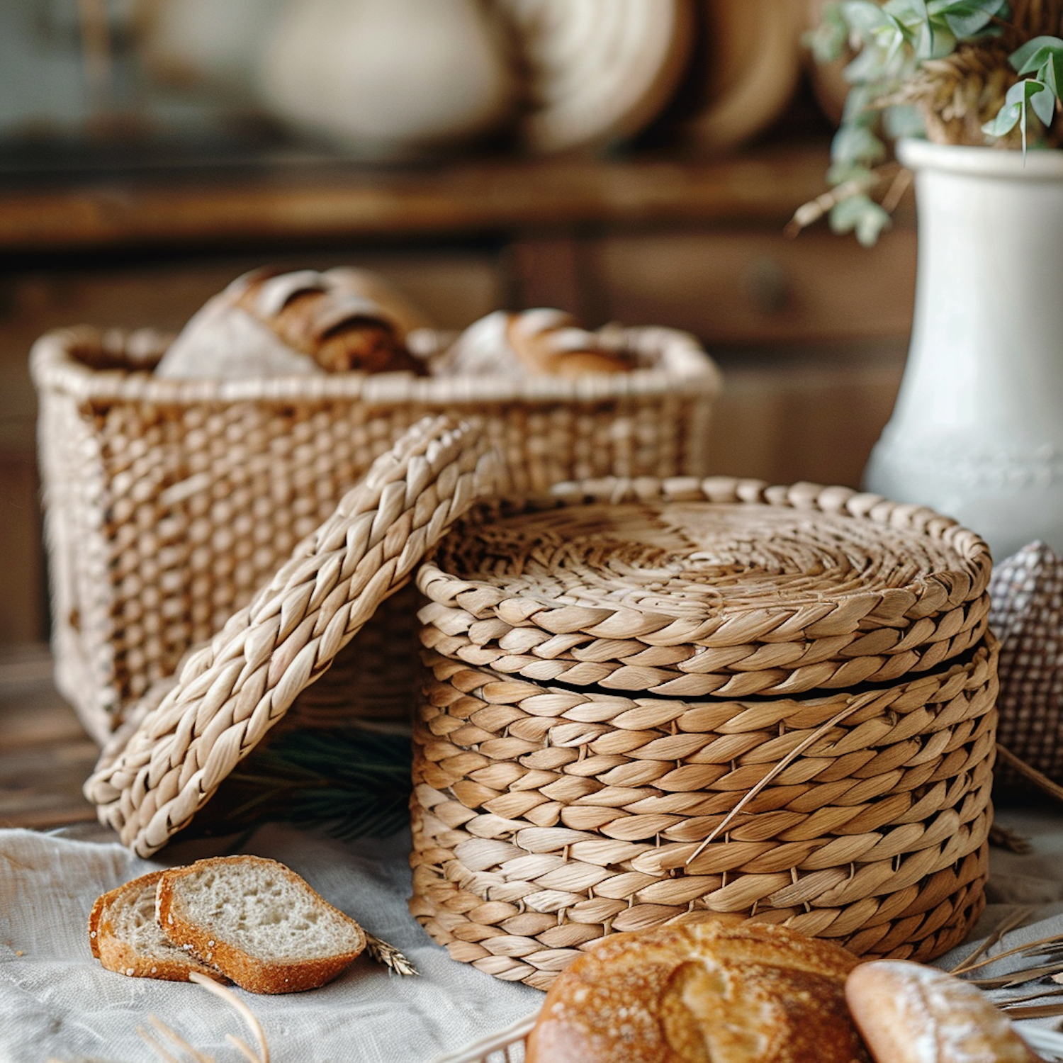 Rustic wicker baskets with fresh bread in a cozy kitchen setting, featuring warm earthy tones and a touch of greenery.