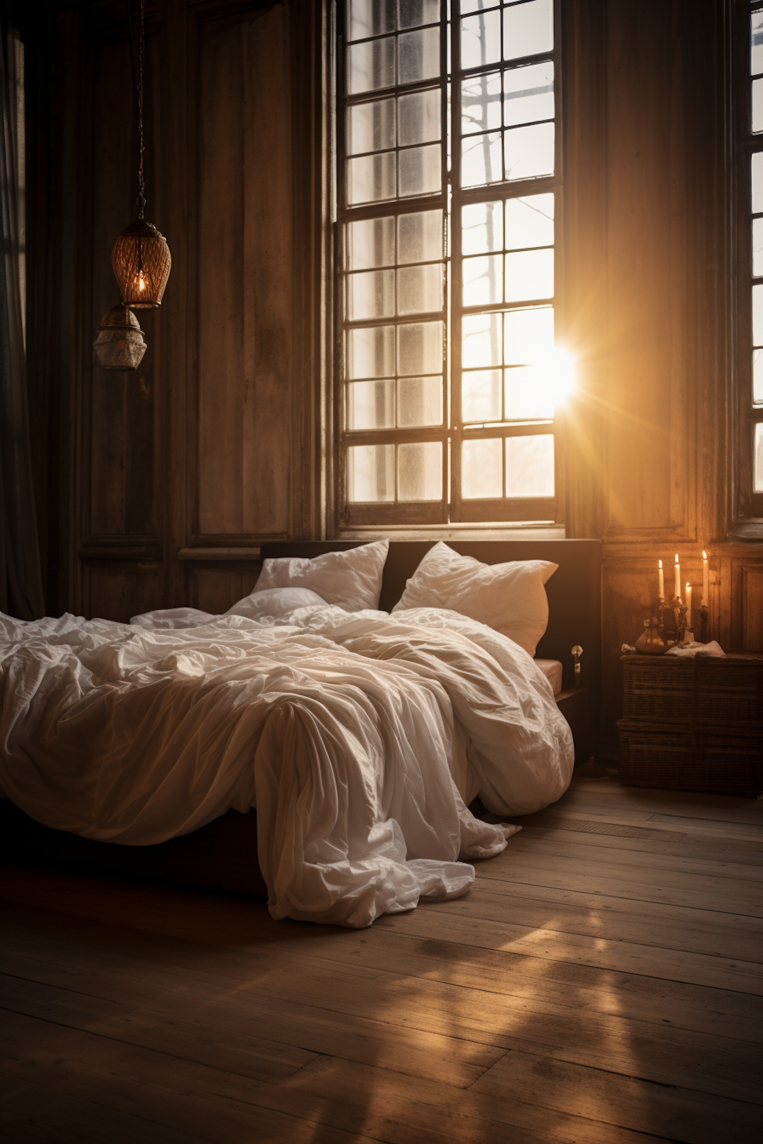 Cozy bedroom with sunlight streaming through large windows, unmade bed with white linens, and lit candles for a warm, inviting atmosphere.