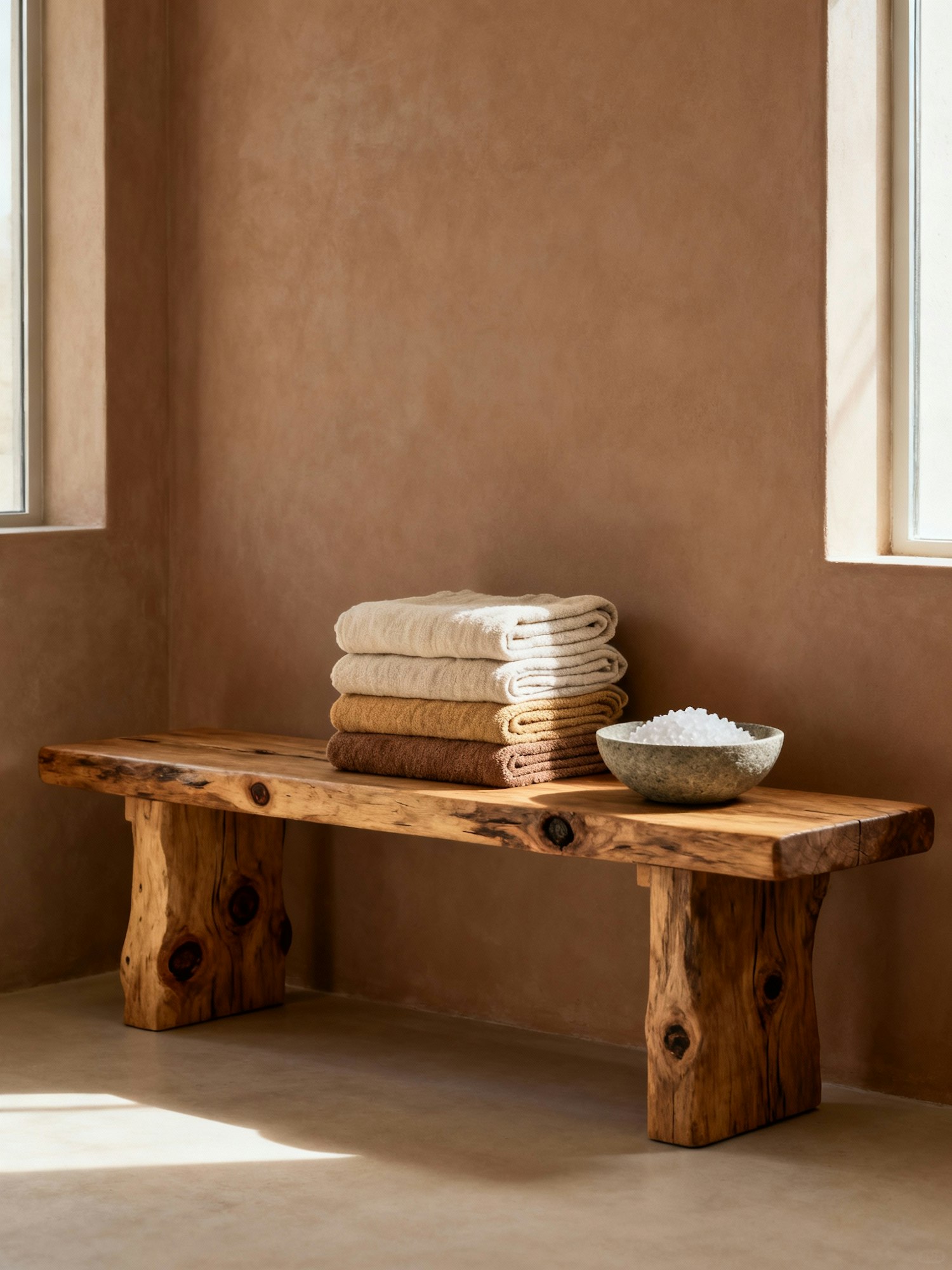 Nordic interior photography, shot in natural daylight — serene and contemplative atmosphere. Soft diffused light from side windows, gentle shadows, warm neutral palette with tones of beige, tan, and muted brown. Use raw and tactile materials like oak wood, linen, stone, brushed metal. Minimal composition with air and negative space. Realistic photo with subtle grain, no overexposure. Architectural framing, calm and timeless design aesthetic inspired by FRAMA — quiet luxury, Scandinavian minimalism, sensory stillness. A rustic bench in natural oak with visible knots and irregularities, placed against a clay-toned wall. On the bench, a stack of folded linen towels in neutral shades and a shallow bowl filled with bath salts. The lighting is dim and warm, creating a spa-like, meditative mood. The materials feel earthy and grounding.
