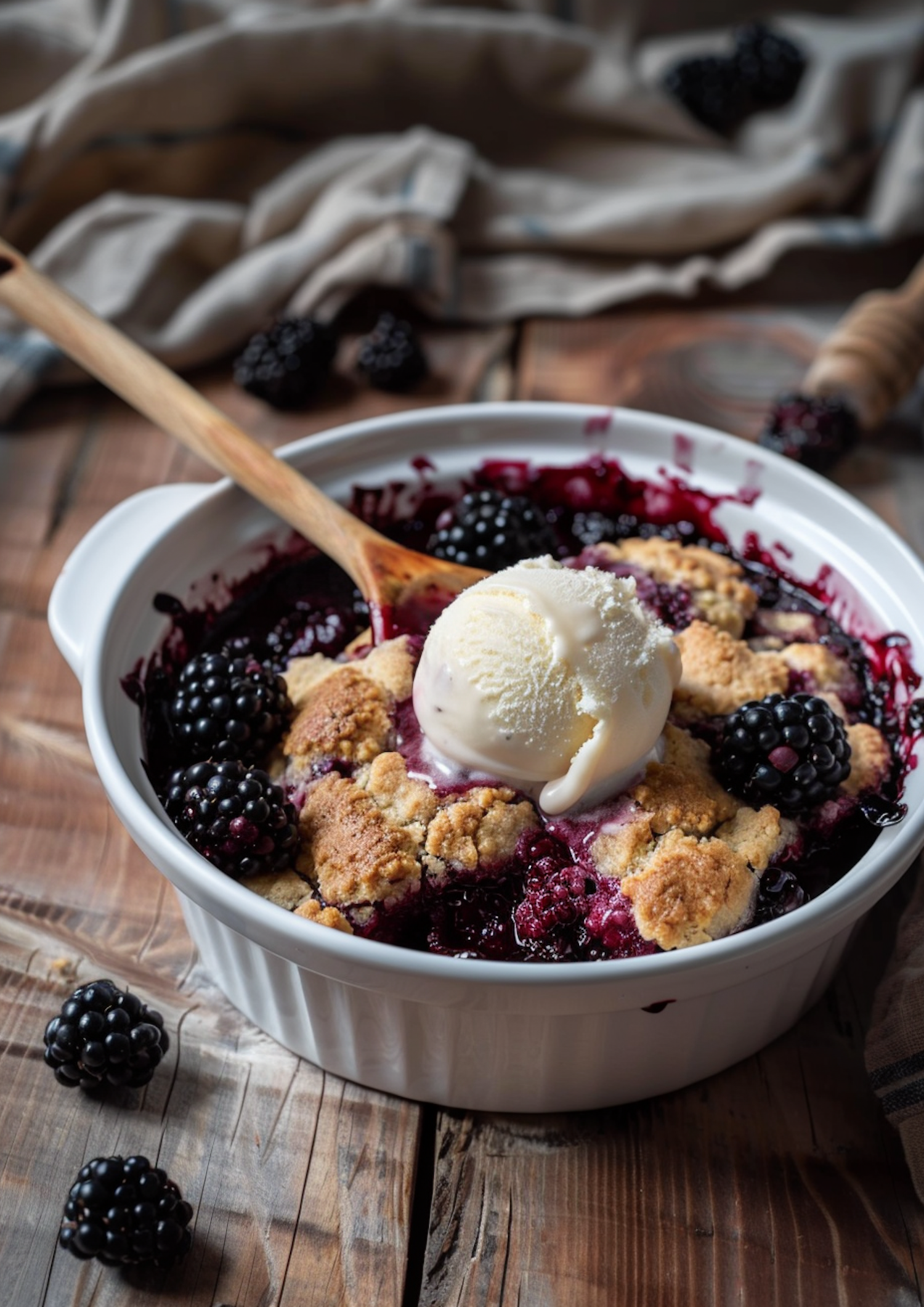 Rustic blackberry cobbler with vanilla ice cream in a white dish on a wooden table, garnished with fresh blackberries.