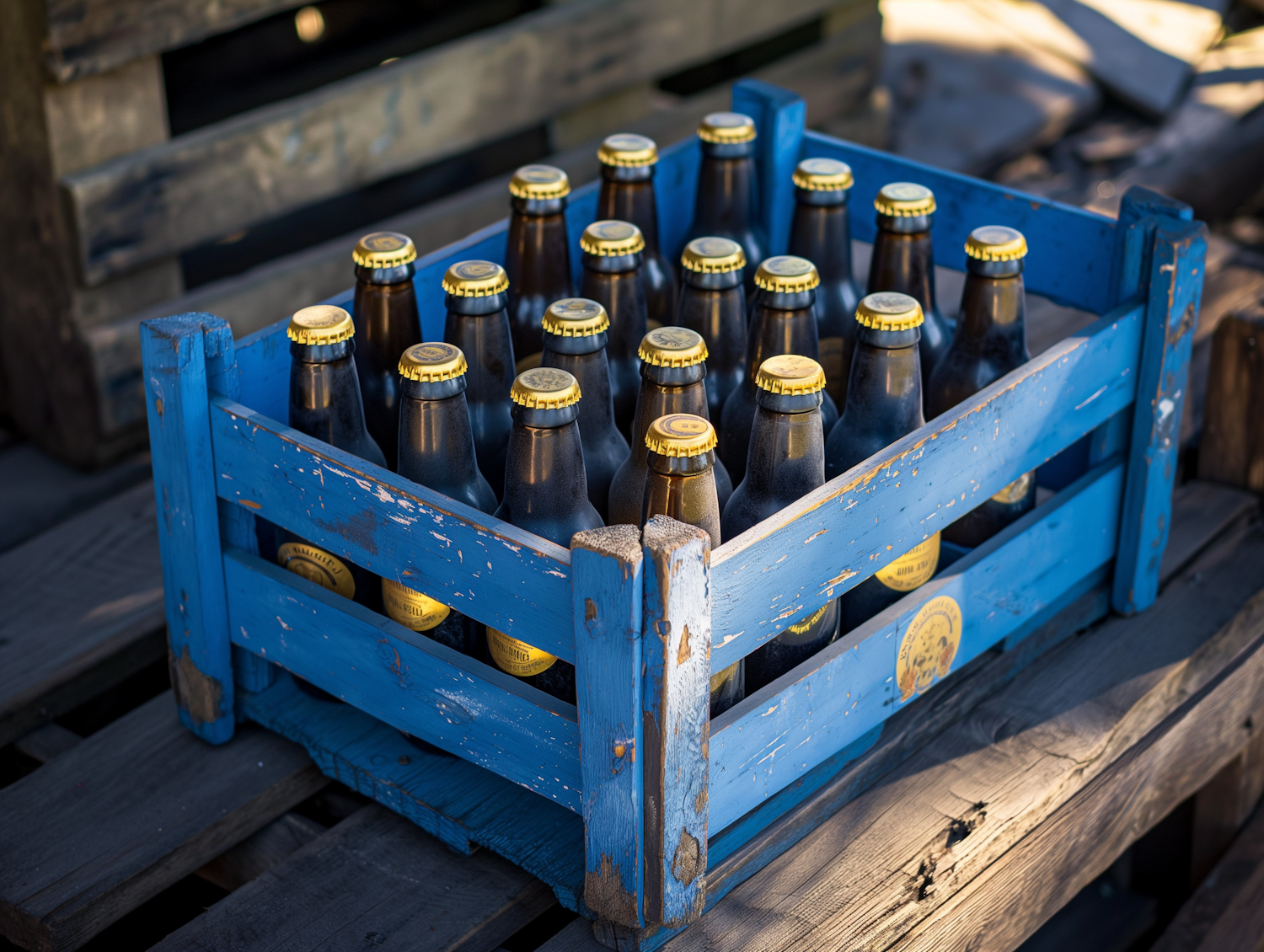 Rustic blue crate with 16 dark glass bottles, golden caps, and branding, set on a wooden pallet in warm outdoor lighting.