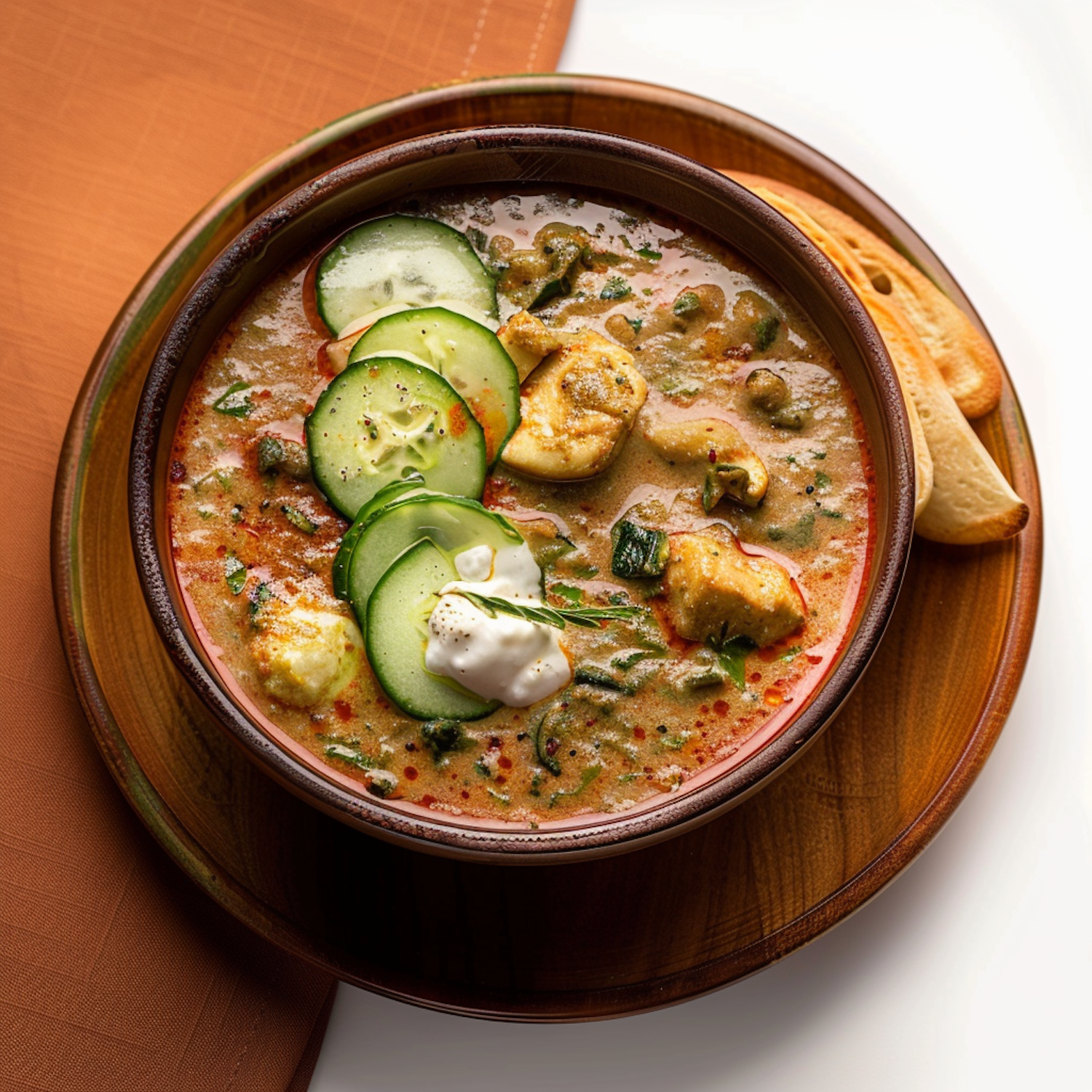 Creamy soup with cucumber slices, chicken, and herbs in a rustic bowl, served with toasted bread on a wooden plate.