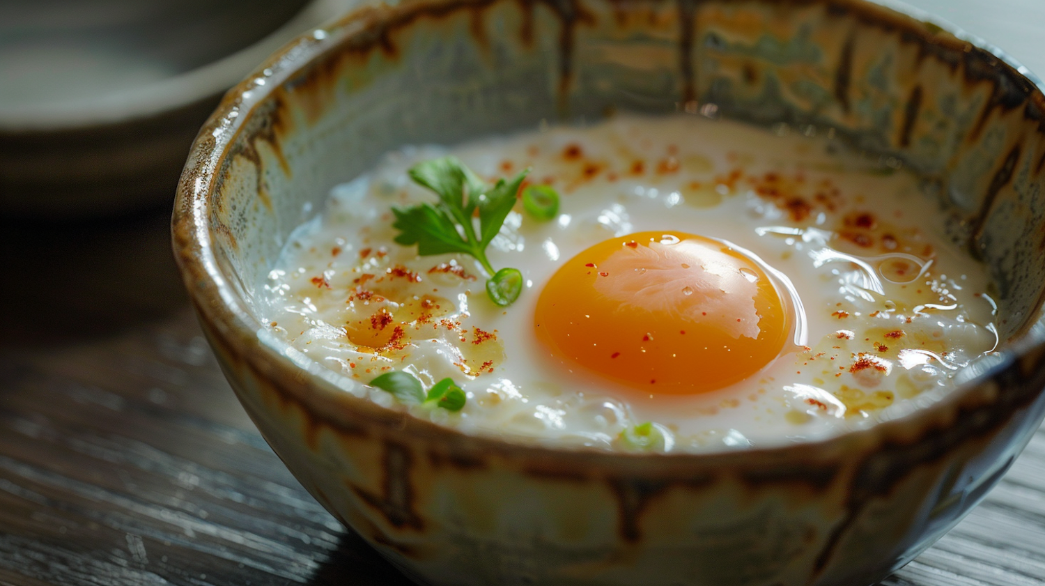 Rustic bowl with a sunny-side-up egg, garnished with chili flakes, green onions, and parsley on a wooden table.