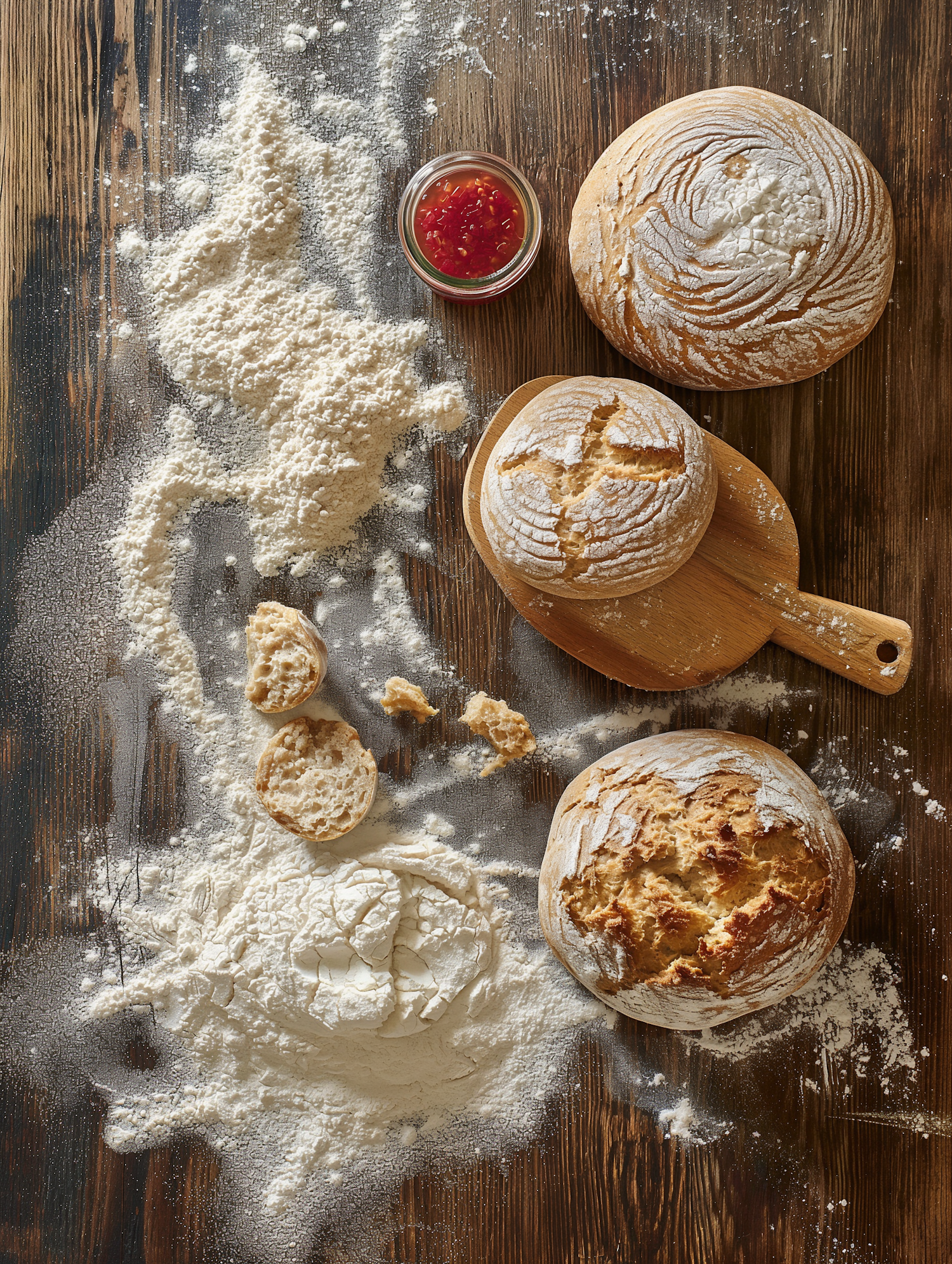 Artisan bread loaves on a flour-dusted table with a jar of red jam, showcasing rustic textures and inviting colors.