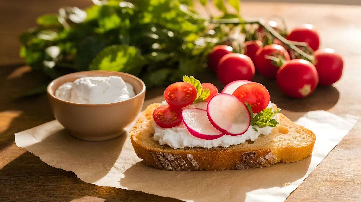 Fresh bread topped with creamy spread, radishes, and tomatoes, paired with a bowl of dip and vibrant greens in warm sunlight.