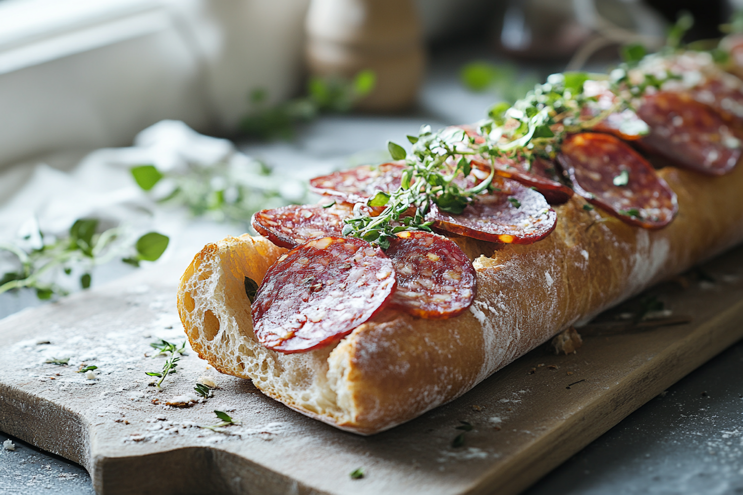 Artisan baguette topped with salami slices and fresh herbs on a rustic board, bathed in natural light.