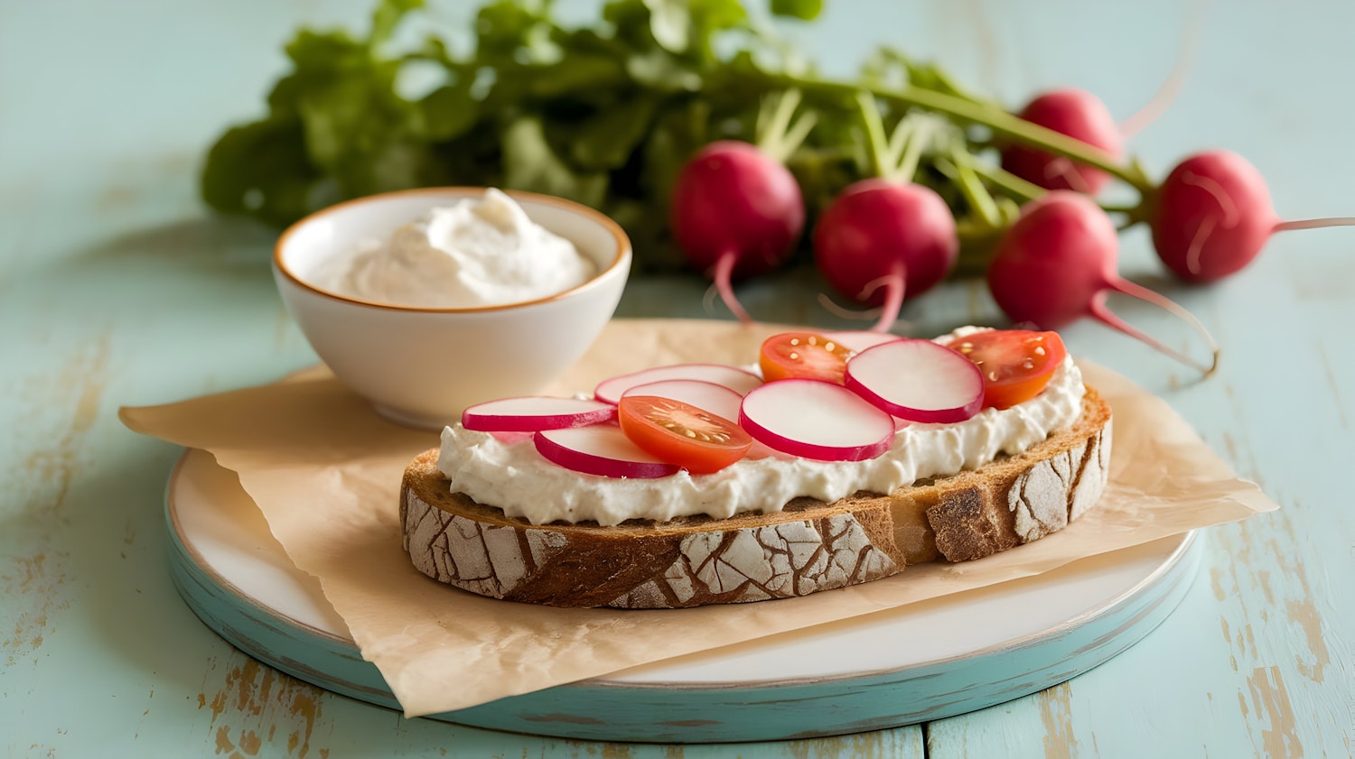 Rustic bread topped with creamy spread, radish slices, and cherry tomatoes, served with fresh radishes and a bowl of spread on the side.