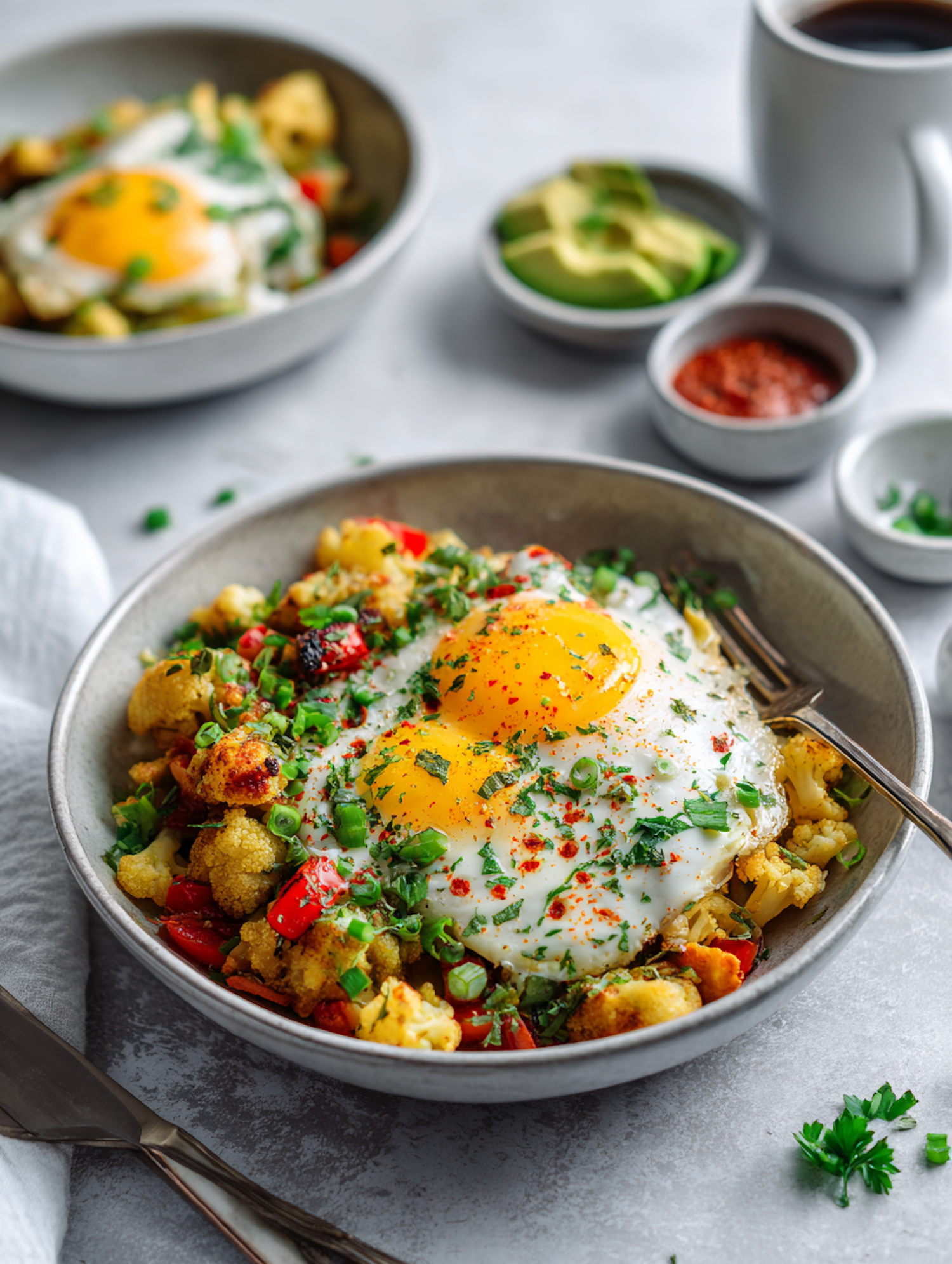 A delicious breakfast bowl with sunny-side-up eggs, roasted vegetables, and fresh herbs, served with avocado and coffee for a perfect start.