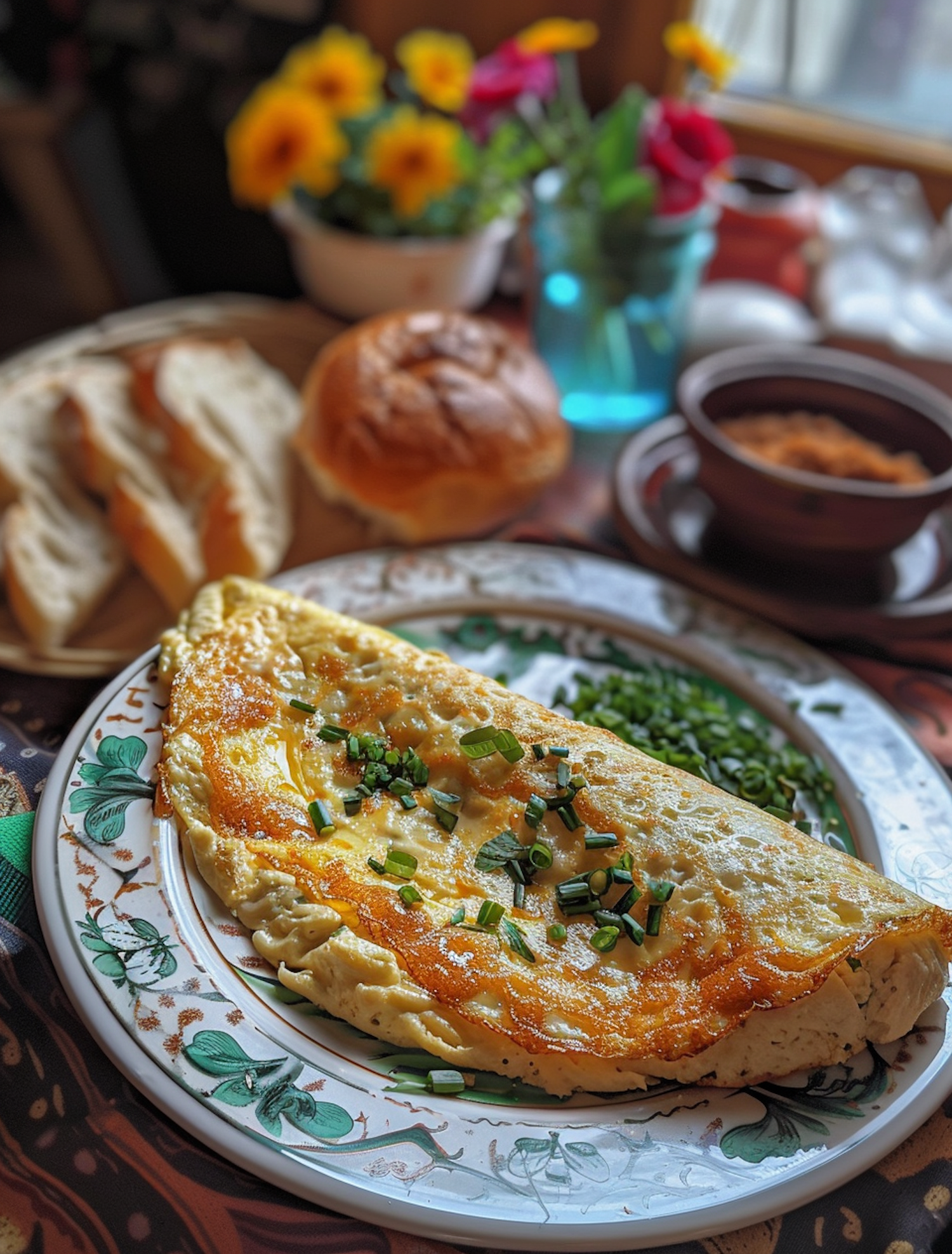 Golden omelette with chives on a floral plate, surrounded by bread and flowers, creating a cozy breakfast setting.