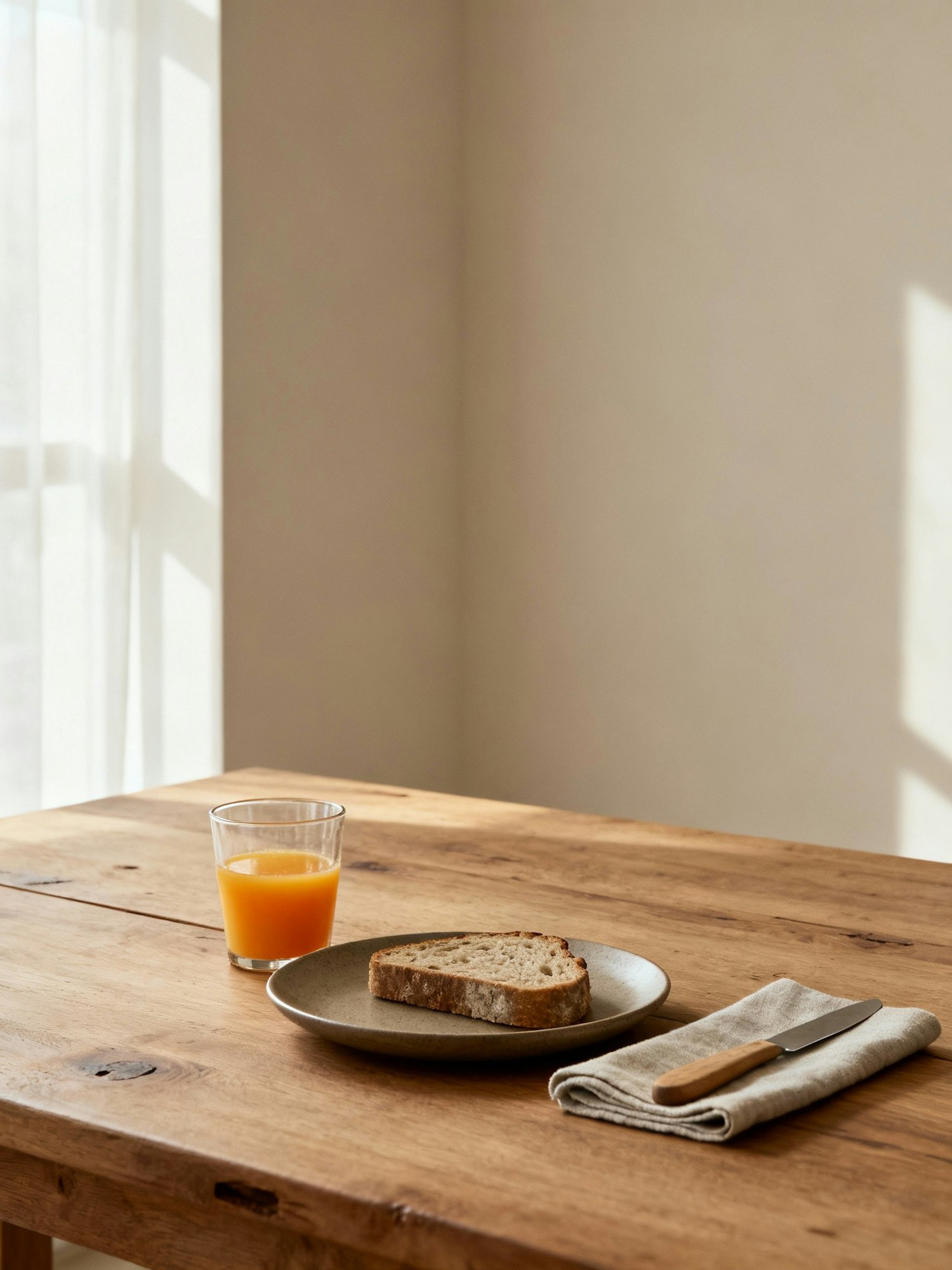 Nordic interior photography, shot in natural daylight — serene and contemplative atmosphere. Soft diffused light from side windows, gentle shadows, warm neutral palette with tones of beige, tan, and muted brown. Use raw and tactile materials like oak wood, linen, stone, brushed metal. Minimal composition with air and negative space. Realistic photo with subtle grain, no overexposure. Architectural framing, calm and timeless design aesthetic inspired by FRAMA — quiet luxury, Scandinavian minimalism, sensory stillness. A breakfast table set with quiet simplicity: a clear glass of orange juice, a slice of rustic bread on a ceramic plate, a folded linen napkin, and a wooden butter knife. The table is raw oak, its surface slightly imperfect. The light comes from the left, casting gentle lines across the fabric and tabletop. The atmosphere is domestic, peaceful, and contemplative.
