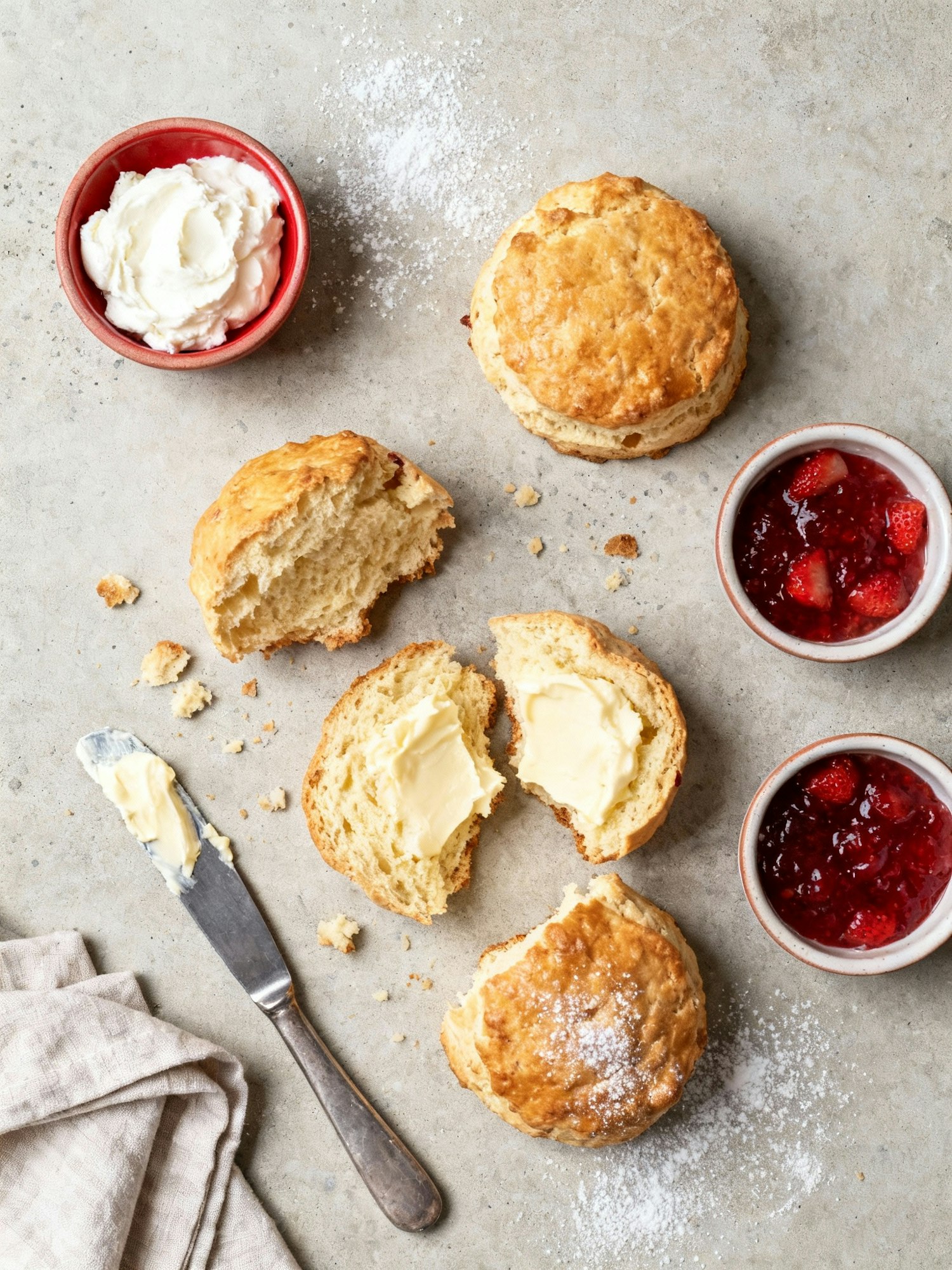 Golden scones with butter, clotted cream, and strawberry jam on a rustic surface, perfect for a cozy breakfast or afternoon tea.
