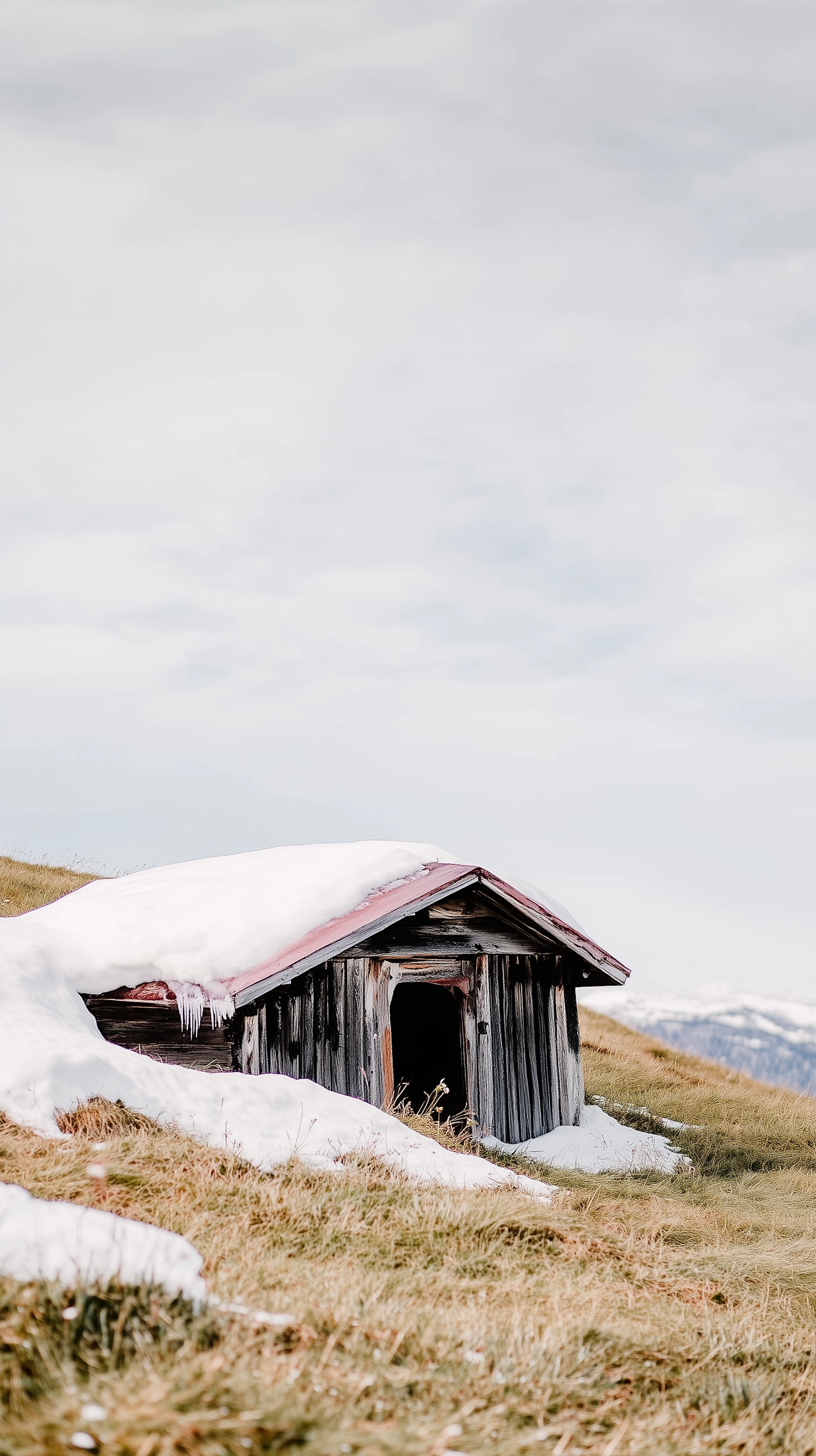 Rustic wooden cabin with snow-covered roof on a grassy hillside, set against distant snow-capped mountains under a cloudy sky.