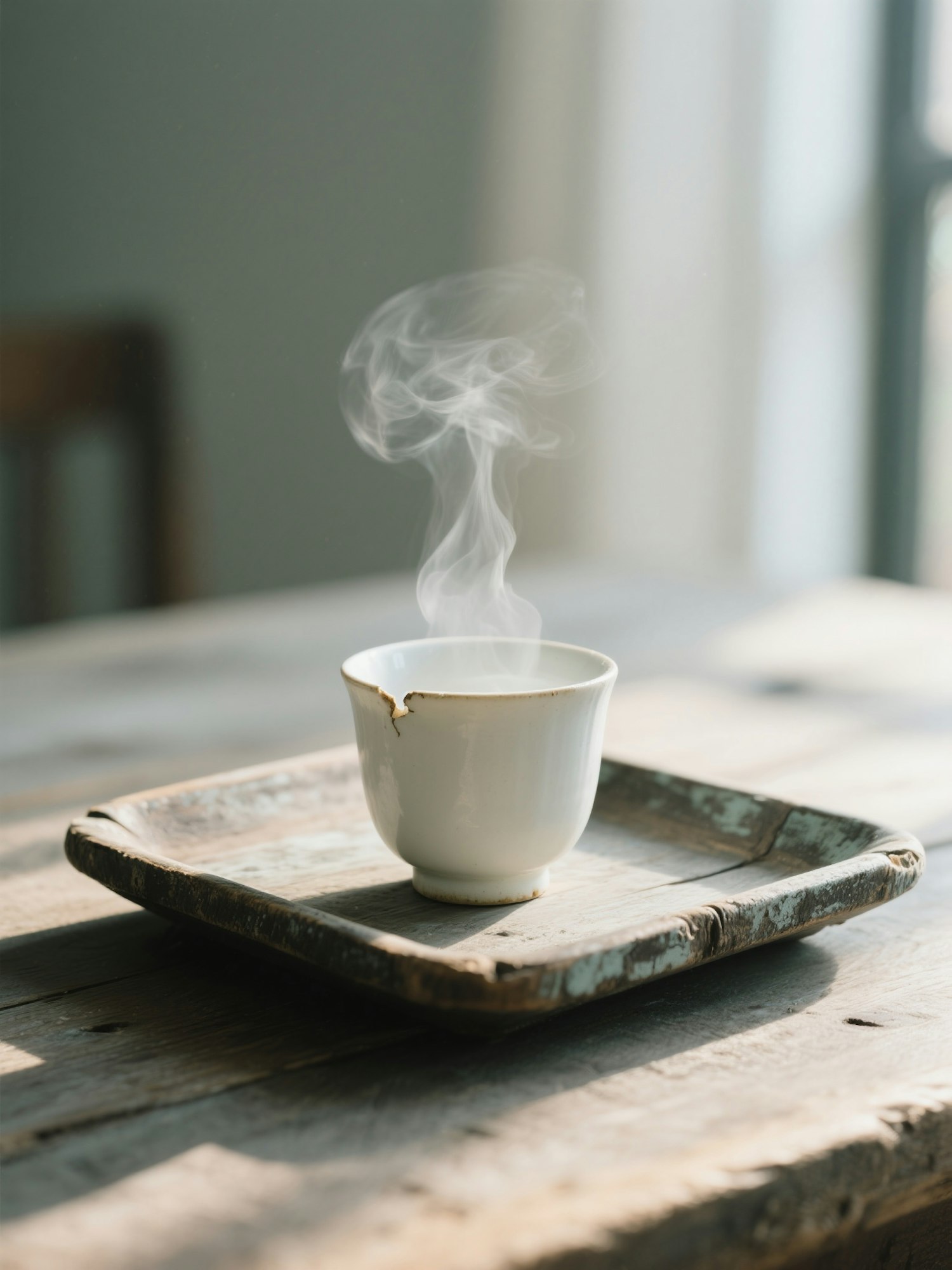 A cracked white ceramic cup with steam rising, placed on a rustic wooden tray on a sunlit table, evoking a cozy and serene atmosphere.