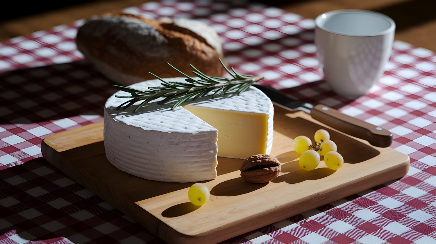 A cozy cheese board with creamy cheese, grapes, walnut, and rosemary on a checkered tablecloth. Perfect for a rustic picnic vibe.