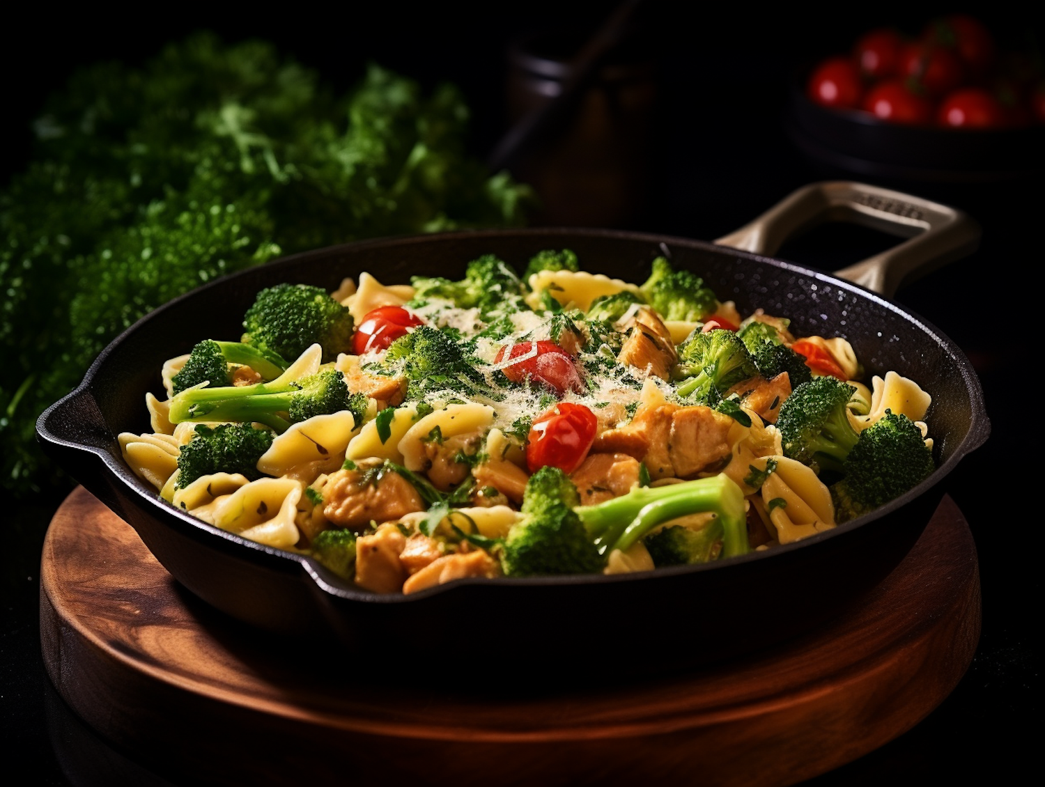 Delicious skillet pasta with chicken, broccoli, cherry tomatoes, and Parmesan, garnished with parsley for a fresh, vibrant meal.