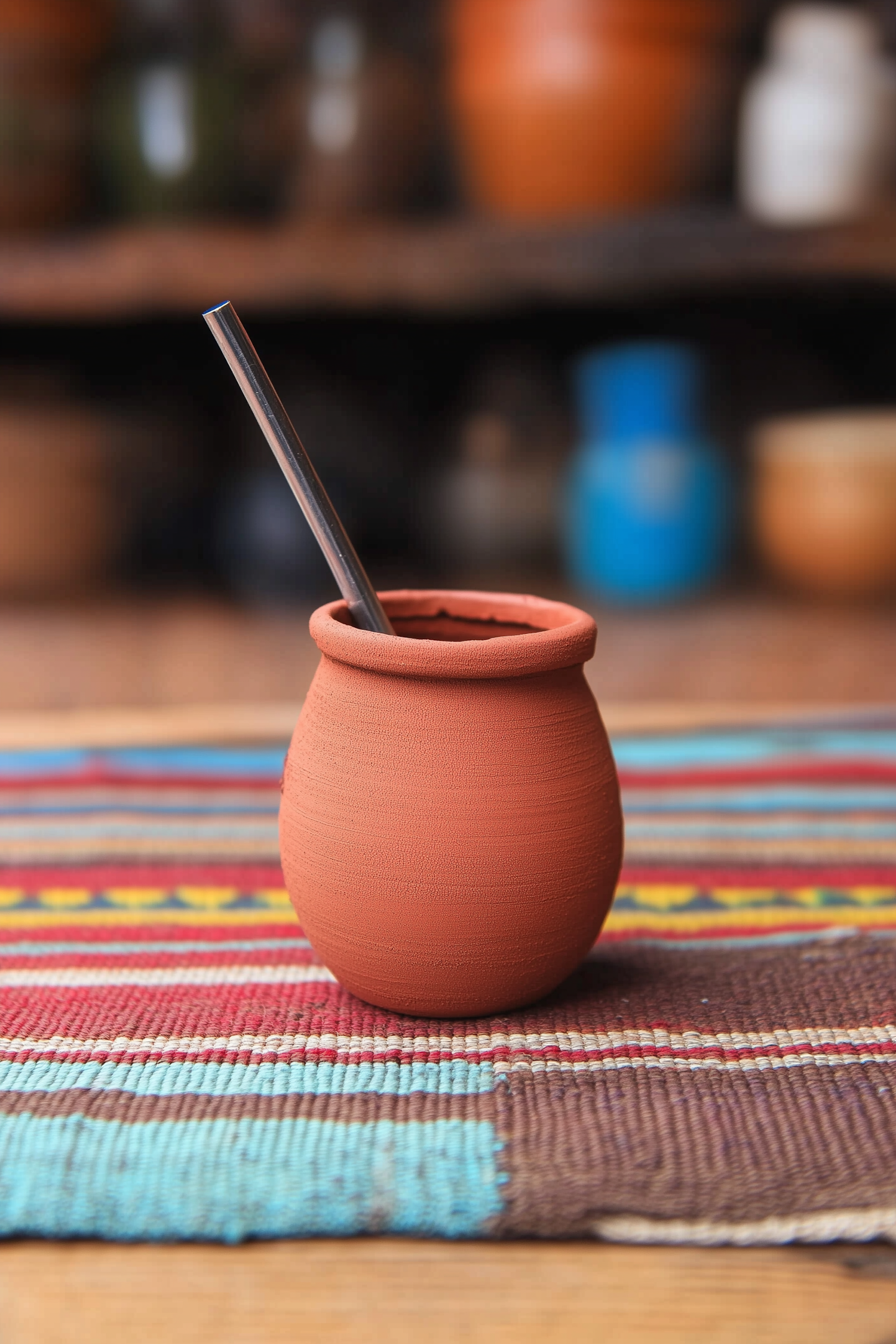 A clay cup with a metal straw on a vibrant woven mat, surrounded by blurred pottery in the background, creating a cozy, rustic vibe.