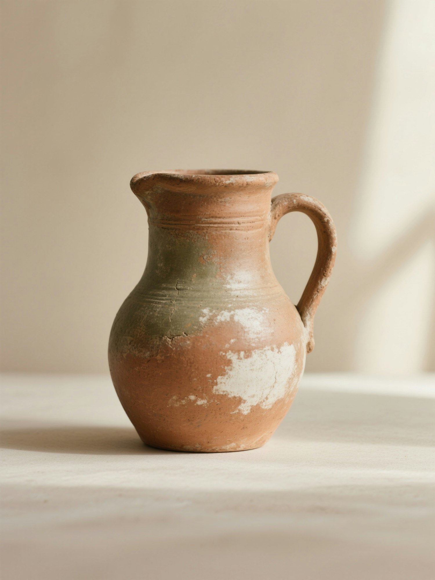 highly realistic photography, rustic handcrafted ceramics, natural daylight, soft shadows, earthy and muted tones (beige, terracotta, warm brown, olive), minimal composition, textured clay surfaces, authentic artisanal atmosphere, calm and organic aesthetic, editorial product photography style. A rustic ancient-inspired pitcher with a single handle, weathered terracotta surface with whitewashed patina, placed against a soft beige backdrop, highlighting aged imperfections.